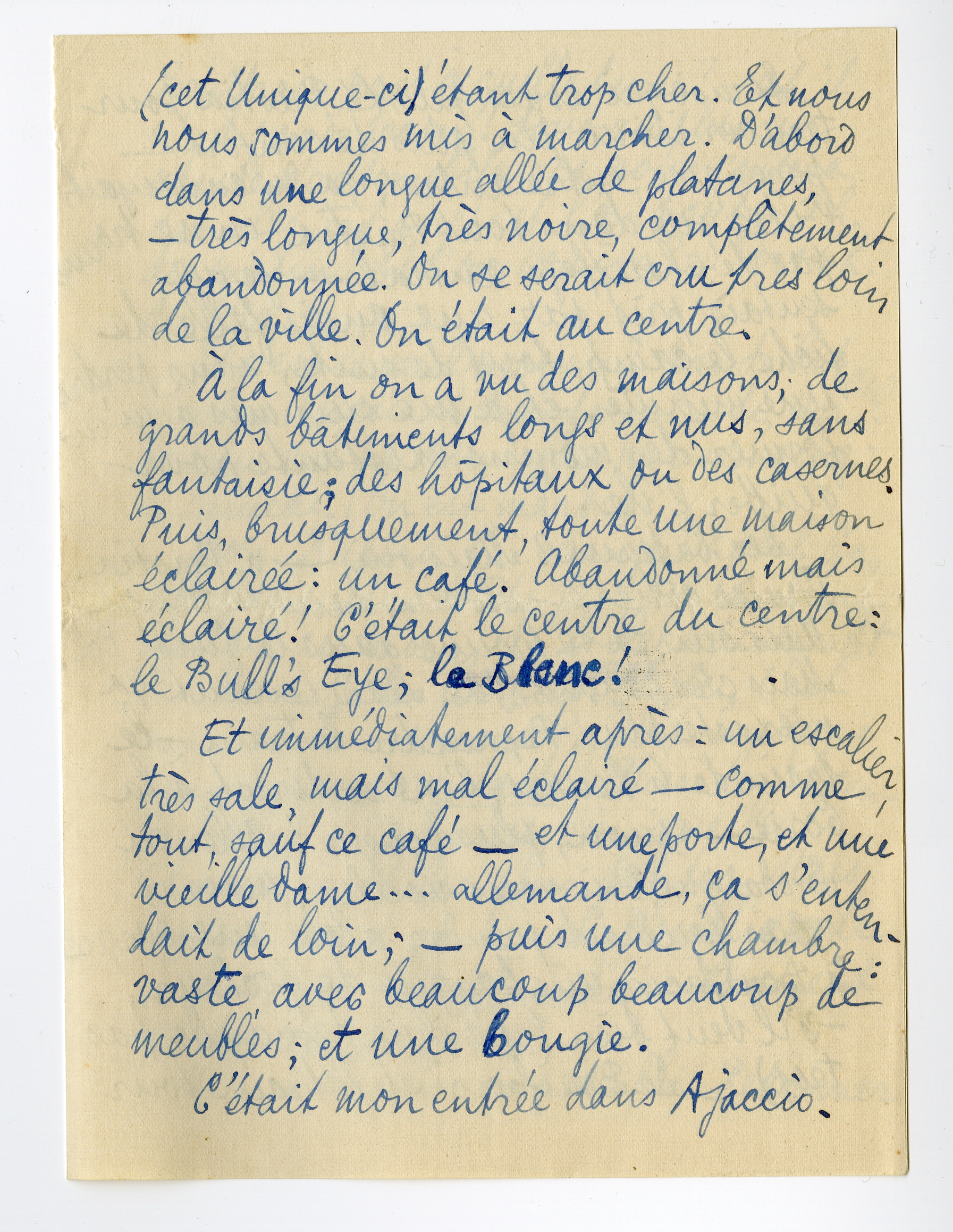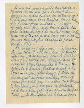 Et moi qui avais quitté Bastia pour trouver ici un peu plus de confort - parce-que, entre autres, ça m'ennuyait, l'idée que dans tout Bastia, on ne trouve pas de chauffage central - je me sentais pris par une anvie folle de fiche le camp, tout de suite, sans perdre une minute, et je me suis mis à m'informer des moyens existants pour quitter l'île.