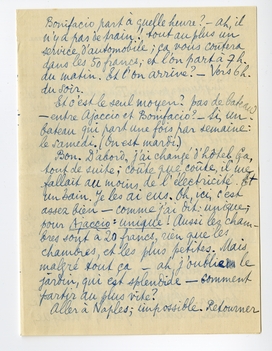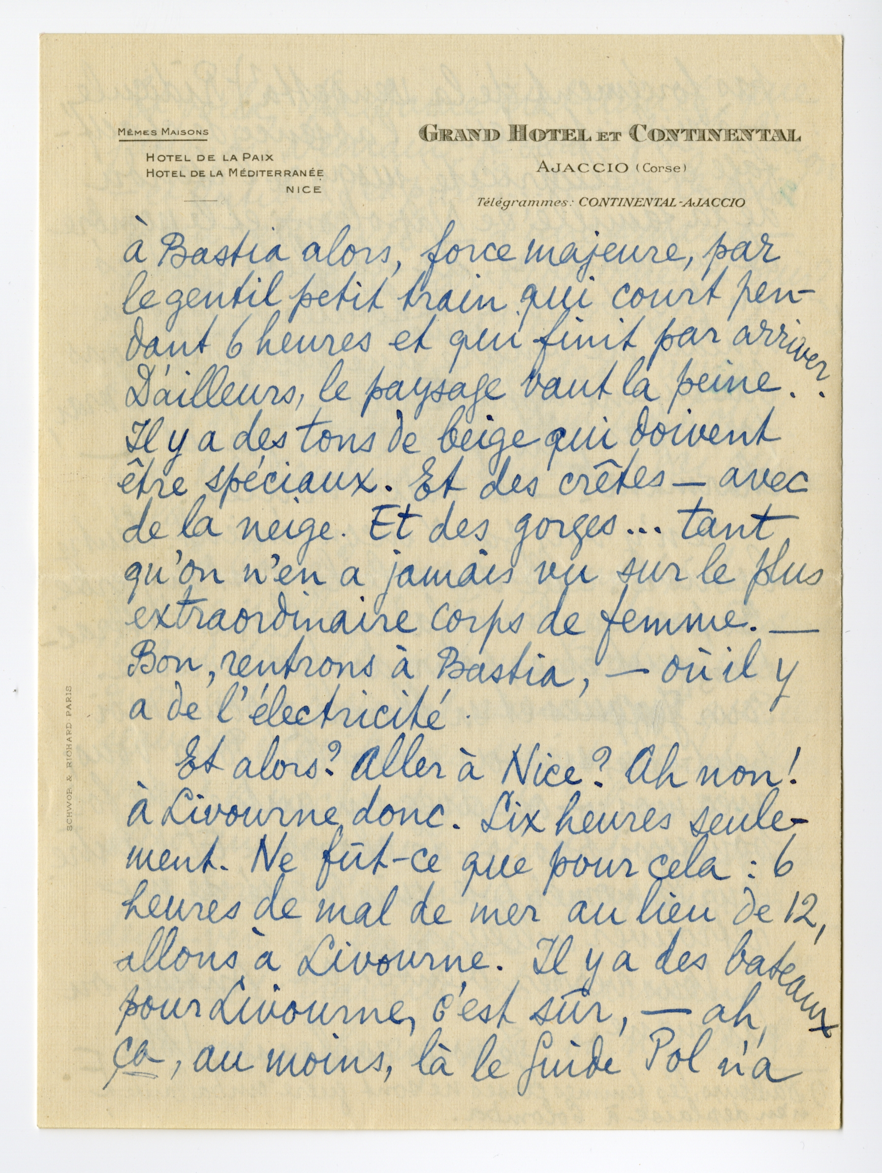 Aller à Naples; impossible. Retourner à Bastia alors, force majeure, par le gentil petit train qui court pendant 6 heures et qui finit par arriver. D'ailleurs, le paysage vaut la peine. Il y a des tons de beige qui doivent être spéciaux. Et des crêtes - avec de la neige. Et des gorges... tant qu'on n'en a jamais vu sur le plus extraordinaire corps de femme. - Bon, rentrons à Bastia, - où il y a de l'électricité.
