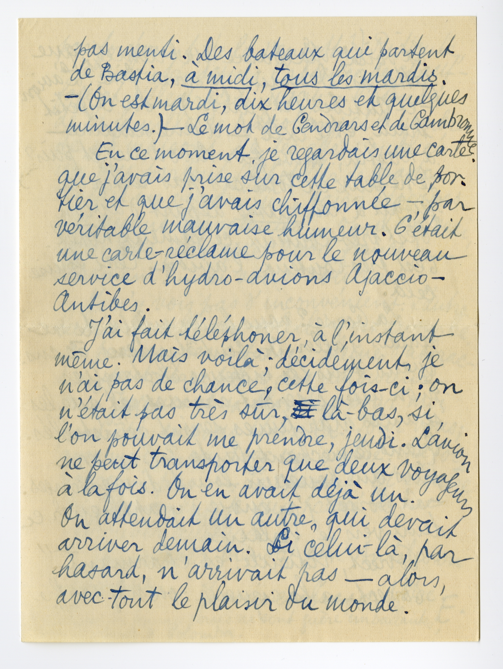 En ce moment, je regardais une carte que j'avais prise sur cette table de portier et que j'avais chiffonnée - par véritable mauvaise humeur. C'était une carte-réclame pour le nouveau service d'hydro-avions Ajaccio-Antibes.