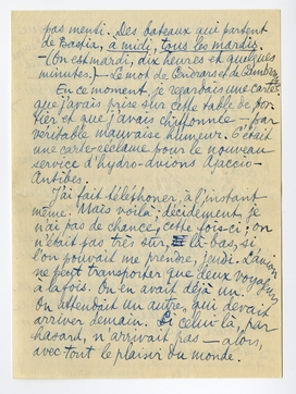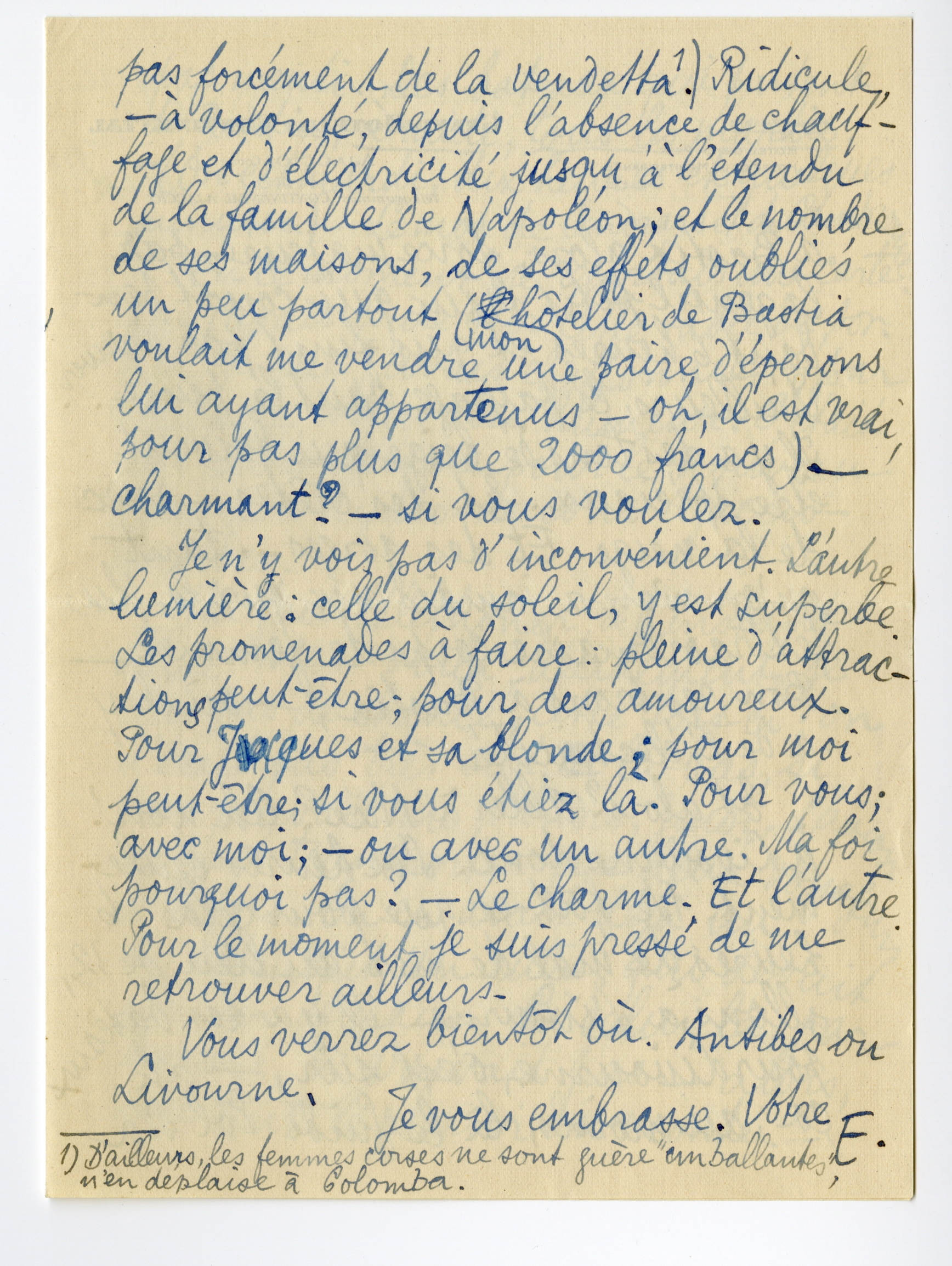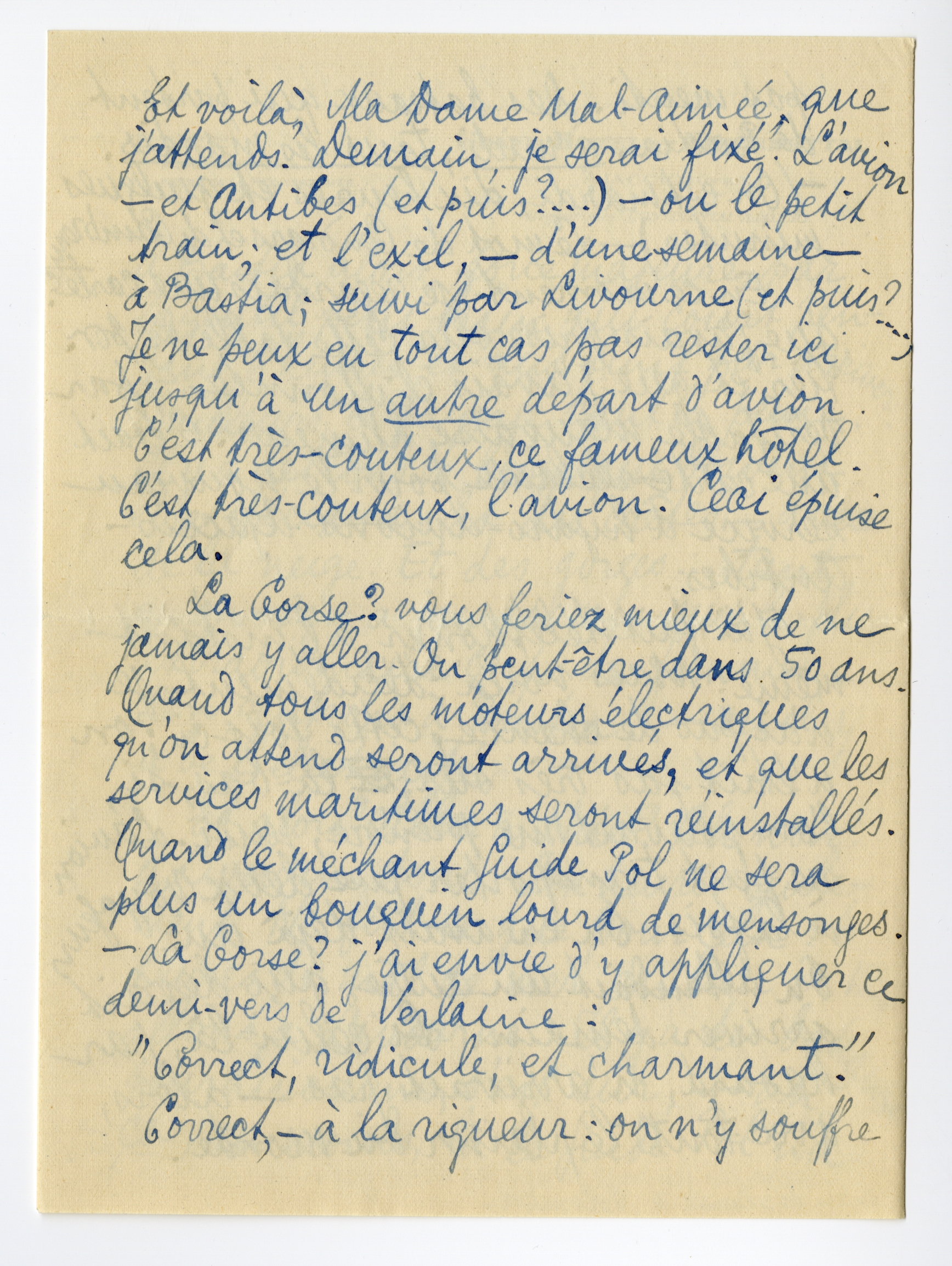 J'ai fait téléphoner, à l'instant même. Mais voilà; décidément, je n'ai pas de chance, cette fois-ci; on n'était pas très sûr, là-bas, si l'on pouvait me prendre, jeudi. L'avion ne peut transporter que deux voyageurs à la fois. On en avait déjà un. On attendait un autre, qui devait arriver demain. Si celui-là, par hasard, n'arrivait pas - alors, avec-tout le plaisir du monde. Et voilà, Ma Dame Mal-Aimée, que j'attends. Demain, je serai fixé. L'avion - et Antibes (et puis?...) - ou le petit train; et l'exil, - d'une semaine - à Bastia; suivi par Livourne (et puis?...) Je ne peux en tout cas pas rester ici jusqu'à un autre départ d'avion. C'est très-couteux -, ce fameux hôtel. C'est très-couteux, l'avion. Ceci épuise cela.