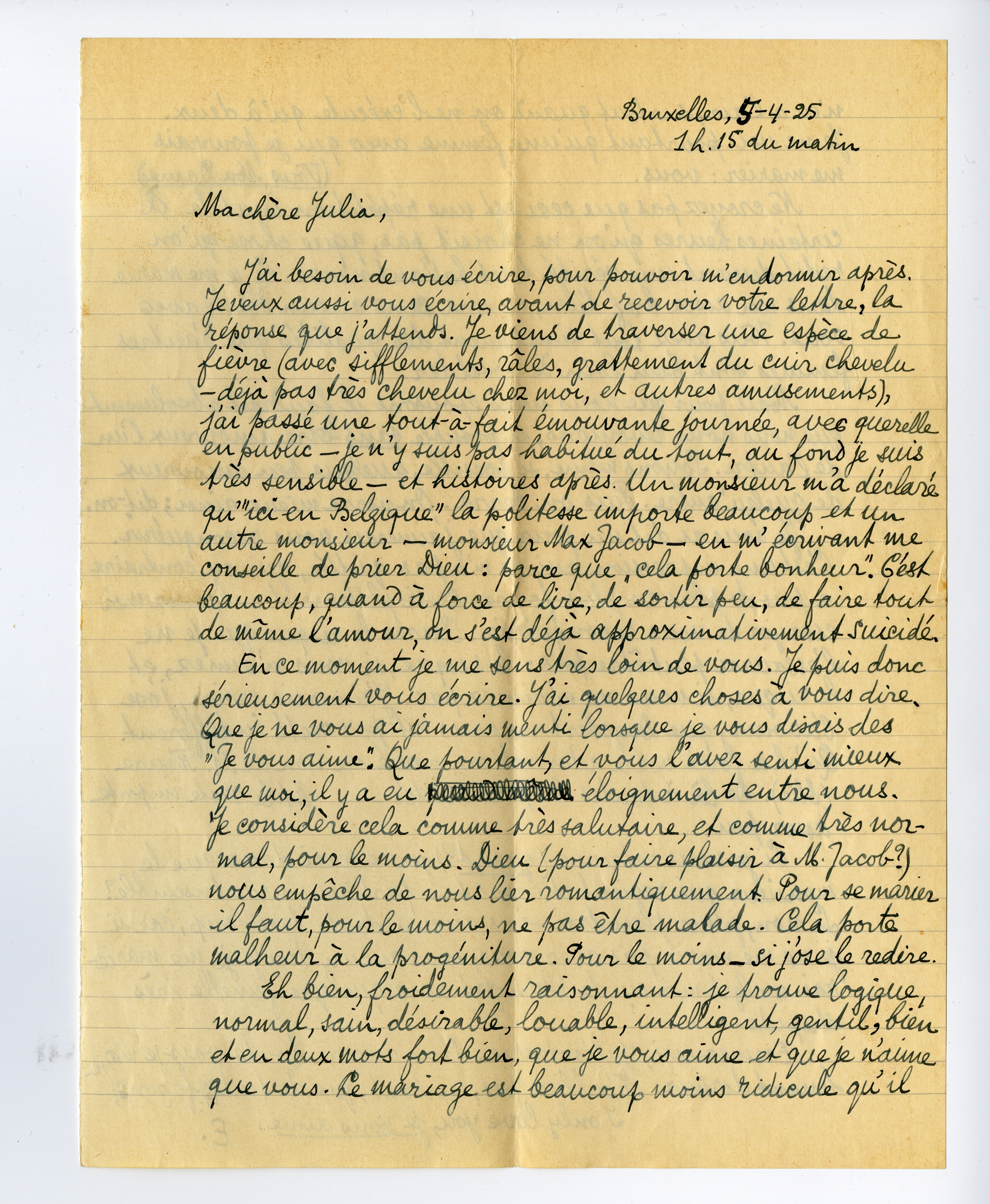 En ce moment je me sens très loin de vous. Je puis donc sérieusement vous écrire. J'ai quelques choses à vous dire. Que je ne vous ai jamais menti lorsque je vous disais des ‘Je vous aime’. Que pourtant, et vous l'avez senti mieux que moi, il y a eu éloignement entre nous. Je considère cela comme très salutaire, et comme très normal, pour le moins. Dieu (pour faire plaisir à M. Jacob?) nous empêche de nous lier romantiquement. Pour se marier il faut, pour le moins, ne pas être malade. Cela porte malheur à la progéniture. Pour le moins - si j'ose le redire.