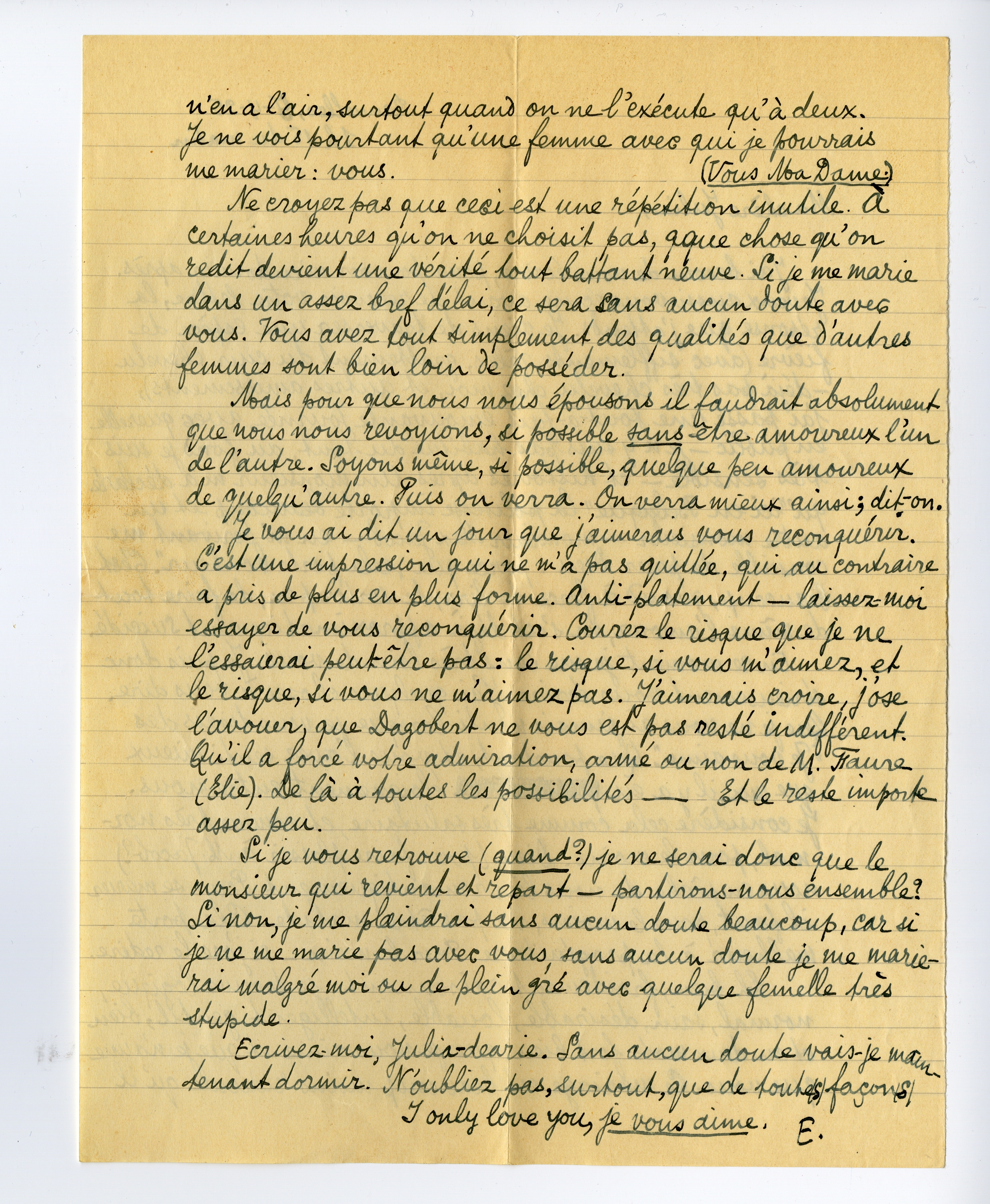 Je vous ai dit un jour que j'aimerais vous reconquérir. C'est une impression qui ne m'a pas quittée, qui au contraire a pris de plus en plus forme. Anti-platement - laissez-moi essayer de vous reconquérir. Courez le risque que je ne l'essaierai peut-être pas: le risque, si vous m'aimez, et le risque, si vous ne m'aimez pas. J'aimerais croire, j'ose l'avouer, que Dagobert ne vous est pas resté indifférent. Qu'il a forcé votre admiration, armé ou non de M. Faure (Elie). De là à toutes les possibilités - Et le reste importe assez peu.