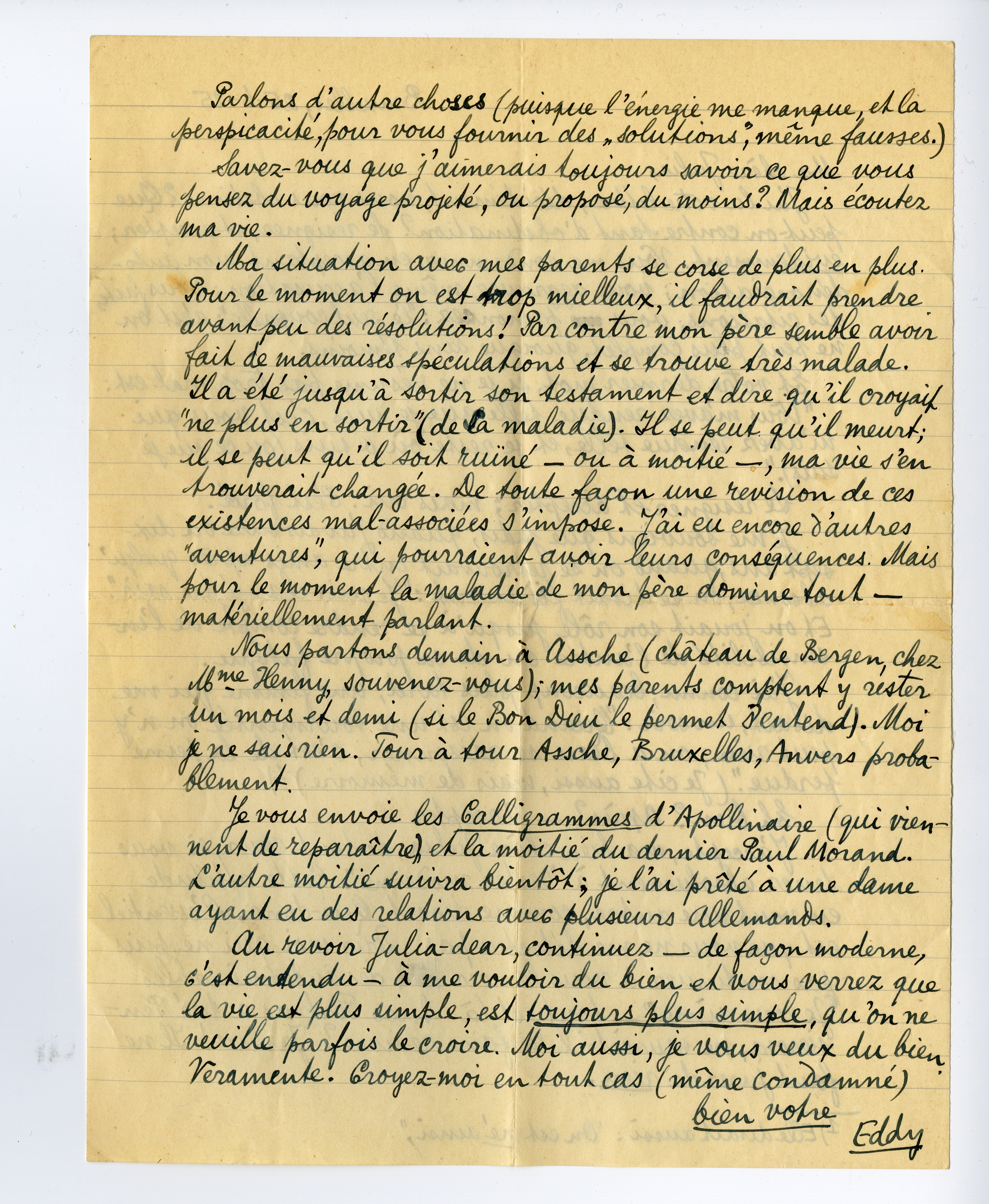 Je vous envoie les Calligrammes d'Apollinaire (qui viennent de reparaître), et la moitié du dernier Paul Morand. L'autre moitié suivra bientôt; je l'ai prêté à une dame ayant eu des relations avec plusieurs Allemands.