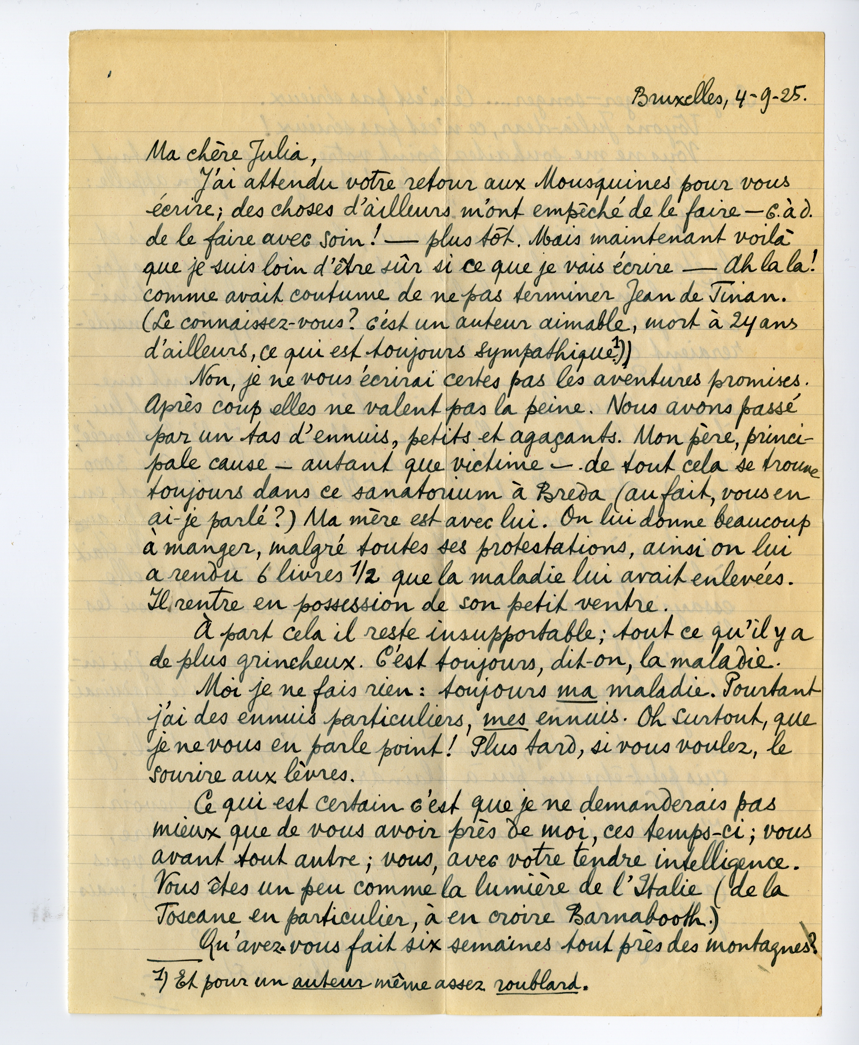 J'ai attendu votre retour aux Mousquines pour vous écrire; des choses d'ailleurs m'ont empêché de le faire - c.à.d. de le faire avec soin! - plus tôt. Mais maintenant voilà que je suis loin d'être sûr si ce que je vais écrire - Ah la la! comme avait coutume de ne pas terminer Jean de Tinan. (Le connaissez-vous? c'est un auteur aimable, mort à 24 ans d'ailleurs, ce qui est toujours sympathique.18)