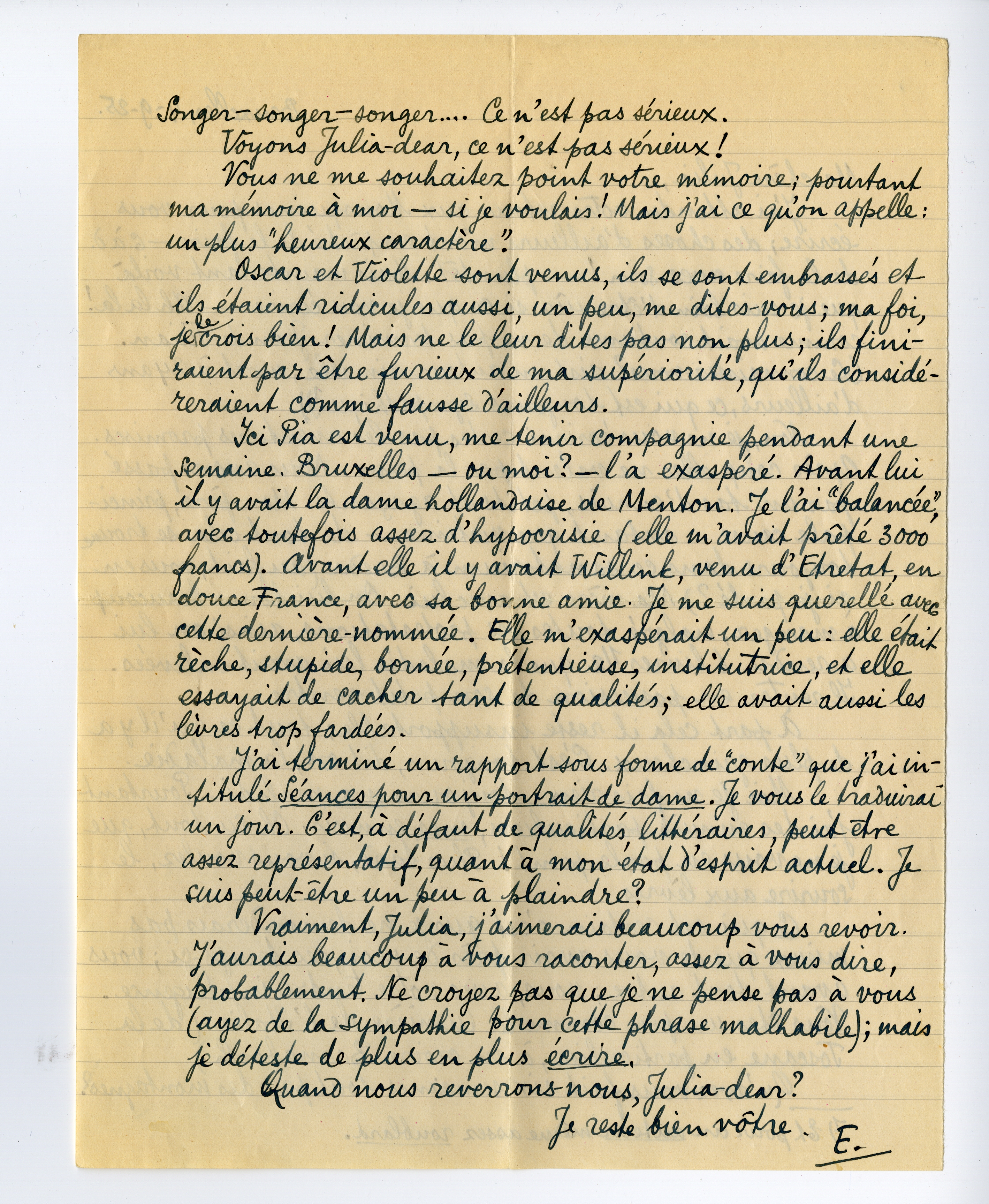 Vraiment, Julia, j'aimerais beaucoup vous revoir. J'aurais beaucoup à vous raconter, assez à vous dire, probablement. Ne croyez pas que je ne pense pas à vous (ayez de la sympathie pour cette phrase malhabile); mais je déteste de plus en plus écrire.