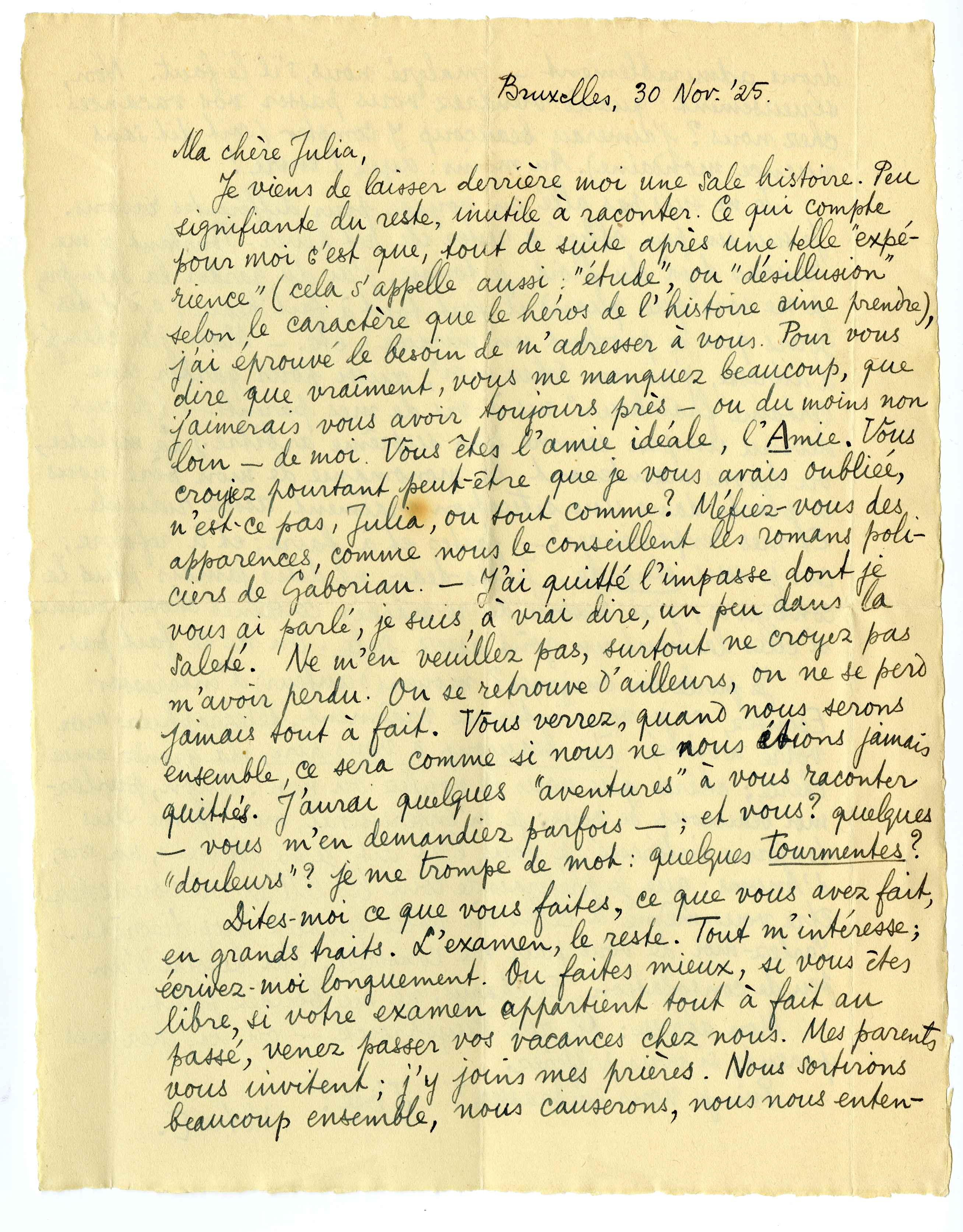 Je viens de laisser derrière moi une sale histoire. Peu signifiante du reste, inutile à raconter. Ce qui compte pour moi c'est que, tout de suite après une telle ‘expérience’ (cela s'appelle aussi: ‘étude’, ou ‘désillusion’ selon le caractère que le héros de l'histoire aime prendre), j'ai éprouvé le besoin de m'adresser à vous. Pour vous dire que vraîment, vous me manquez beaucoup, que j'aimerais vous avoir toujours près - ou du moins non loin - de moi. Vous êtes l'aime idéale, l'Amie. Vous croyiez pourtant peut-être que je vous avais oubliée, n'est-ce pas, Julia, ou tout comme? Méfiez-vous des apparences, comme nous le conseillent les romans policiers de Gaboriau. - J'ai quitté l'impasse dont je vous ai parlé, je suis, à vrai dire, un peu dans la saleté. Ne m'en veuillez pas, surtout ne croyez pas m'avoir perdu. On se retrouve d'ailleurs, on ne se perd jamais tout à fait. Vous verrez, quand nous serons ensemble, ce sera comme si nous ne nous étions jamais quittés. J'aurai quelques ‘aventures’ à vous raconter - vous m'en demandiez parfois -; et vous? quelques ‘douleurs’? je me trompe de mot: quelques tourmentes?