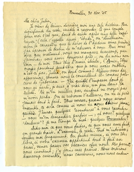 Je ne suis pas allé en voyage pour différentes raisons. Je suis un peu obligé à rester ici cet hiver. Pourtant je me ressens déjà du froid, je tousse, j'ai dû garder la chambre, je ne sors que quand il fait tout à fait beau (c.à.d. les jours que se produit un miracle), etc. - Mais j'ai changé d'adresse, j'ai un ‘chez moi’; aussi pour garder une certaine ‘fraîcheur’ vis-à-vis de mes parents - (je suis devenu un peu comme leur suprême arbitre.) La maladie, ou disons maintenant: la monomanie de mon père nous a placés dans une situation vraîment assez ridicule. Et mes ‘expériences’ - faites et à faire; et à refaire; car je suis stupide, Julia-dear, ne dites jamais plus le contraire; j'ai besoin de re-mâcher certaines choses, même si elles laissent un goût assez sale. On ne se fait pas.
