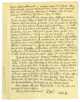 Dites-moi ce que vous faites, ce que vous avez fait, en grands traits. L'examen, le reste. Tout m'intéresse; écrivez-moi longuement. Ou faites mieux, si vous êtes libre, si votre examen appartient tout à fait au passé, venez passer vos vacances chez nous. Mes parents vous invitent; j'y joins mes prières. Nous sortirons beaucoup ensemble, nous causerons, nous nous entendrons admirablement - malgré nous, s'il le faut. Non, sérieusement: quand viendrez-vous passer vos vacances chez nous? j'aimerais beaucoup y compter (soit dit sans nuance mondaine). Au moins: ayez l'envie!