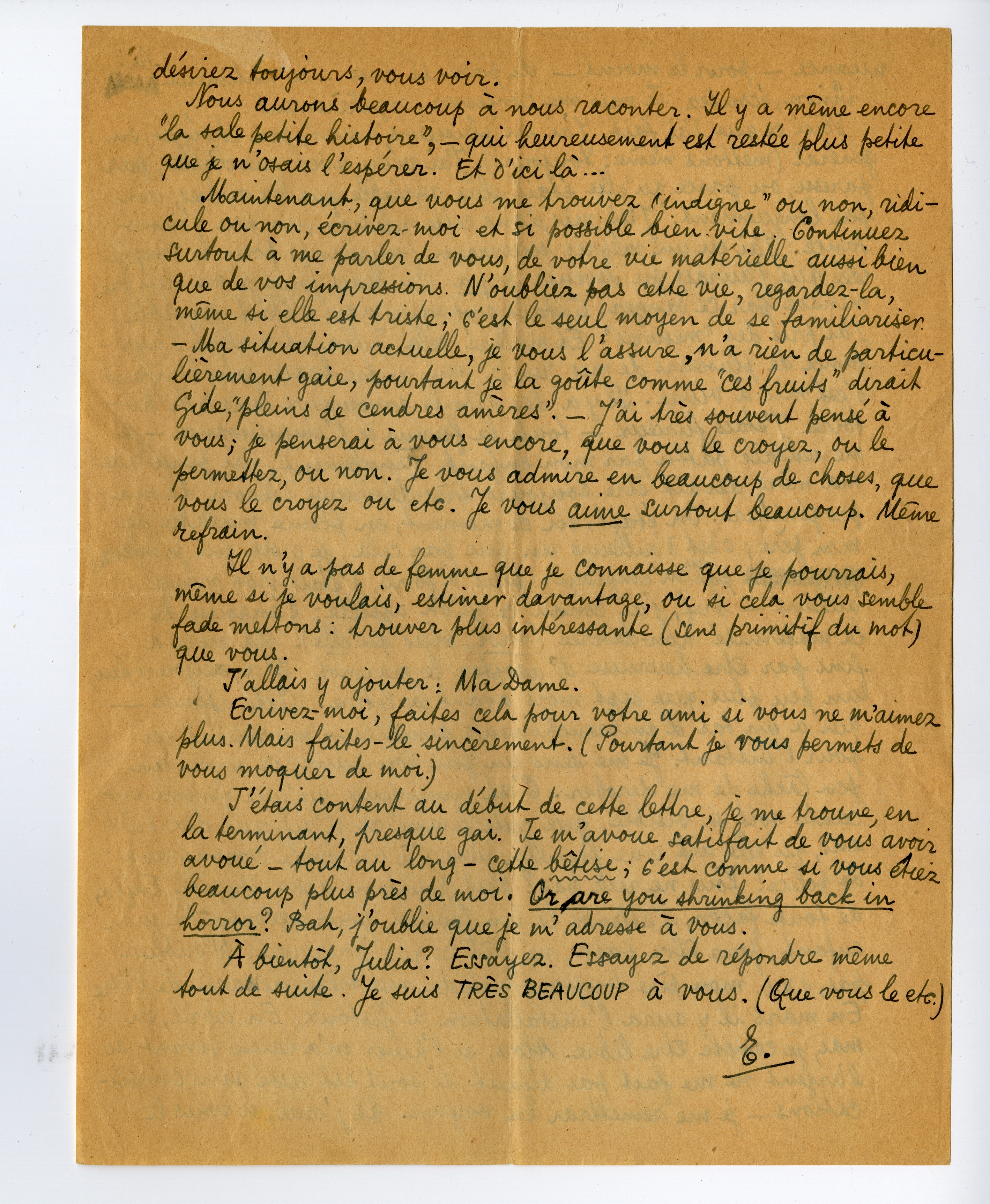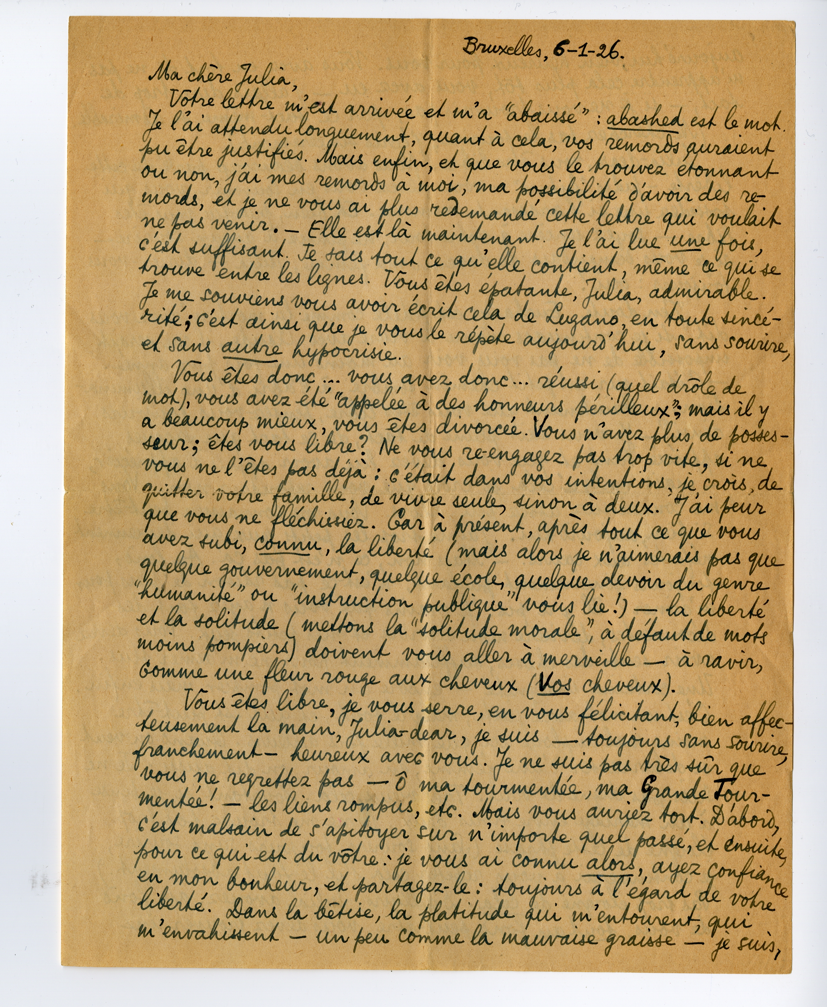 Votre lettre m'est arrivée et m'a ‘abaissé’: abashed est le mot. Je l'ai attendu longuement, quant à cela, vos remords auraient pu être justifiés. Mais enfin, et que vous le trouvez étonnant ou non, j'ai mes remords à moi, ma possibilité d'avoir des remords, et je ne vous ai plus redemandé cette lettre qui voulait ne pas venir. - Elle est là maintenant. Je l'ai lue une fois, c'est suffisant. Je sais tout ce qu'elle contient, même ce qui se trouve entre les lignes. Vous êtes épatante, Julia, admirable. Je me souviens vous avoir écrit cela de Lugano, en toute sincérité; c'est ainsi que je vous le répète aujourd'hui, sans sourire, et sans autre hypocrisie.