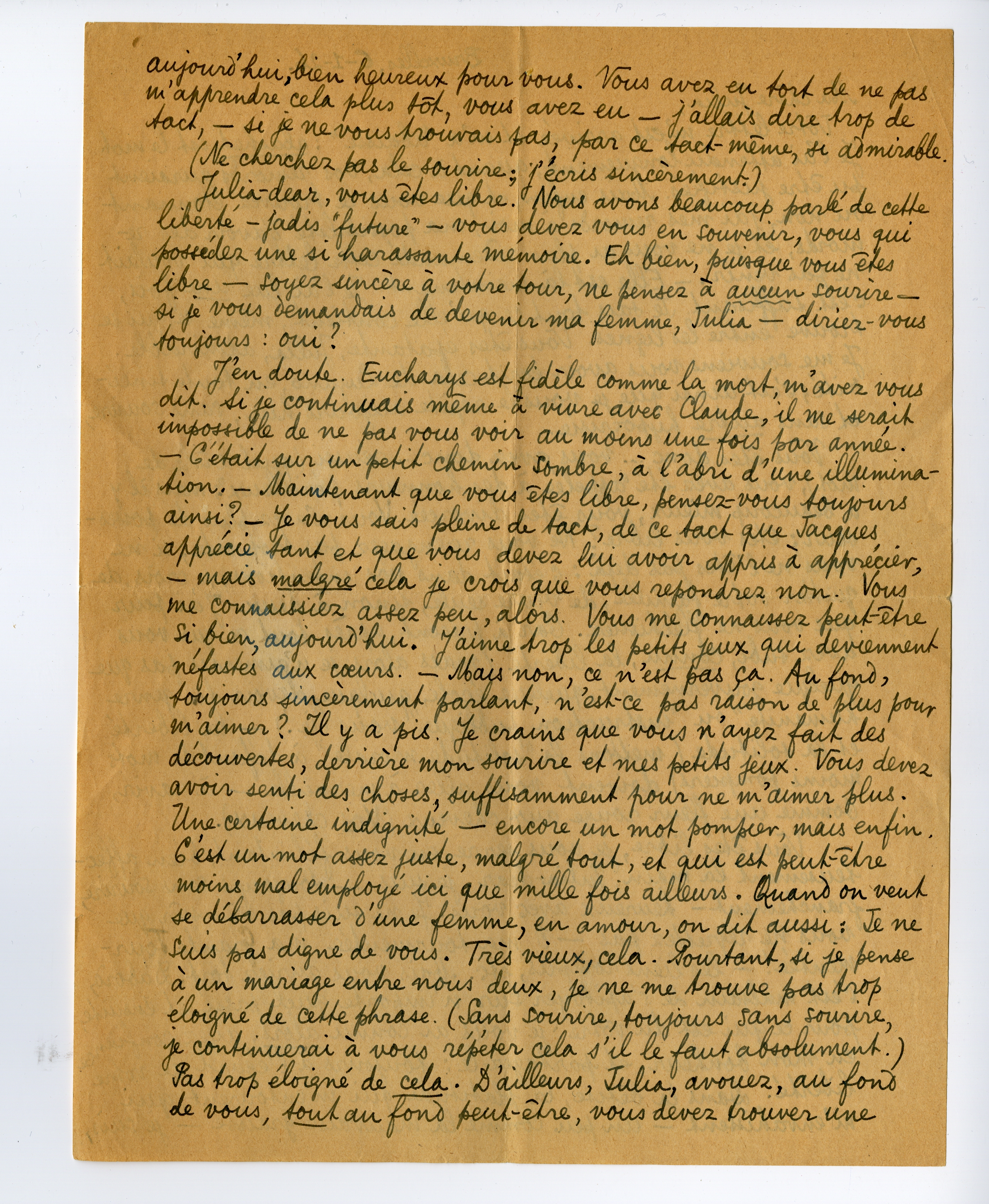 Vous êtes libre, je vous serre, en vous félicitant, bien affecteusement la main, Julia-dear, je suis - toujours sans sourire, franchement - heureux avec vous. Je ne suis pas très sûr que vous ne regrettez pas - ô ma tourmentée, ma Grande Tourmentée! - les liens rompus, etc. Mais vous auriez tort. D'abord, c'est malsain de s'apitoyer sur n'importe quel passé, et ensuite, pour ce qui est du vôtre: je vous ai connu alors, ayez confiance en mon bonheur, et partagez-le: toujours à l'égard de votre liberté. Dans la bêtise, la platitude qui m'entourent, qui m'envahissent - un peu comme la mauvaise graisse - je suis, aujourd'hui, bien heureux pour vous. Vous avez en tort de ne pas m'apprendre cela plus tôt, vous avez eu - j'allais dire trop de tact, - si je ne vous trouvais pas, par ce tact-même, si admirable