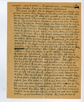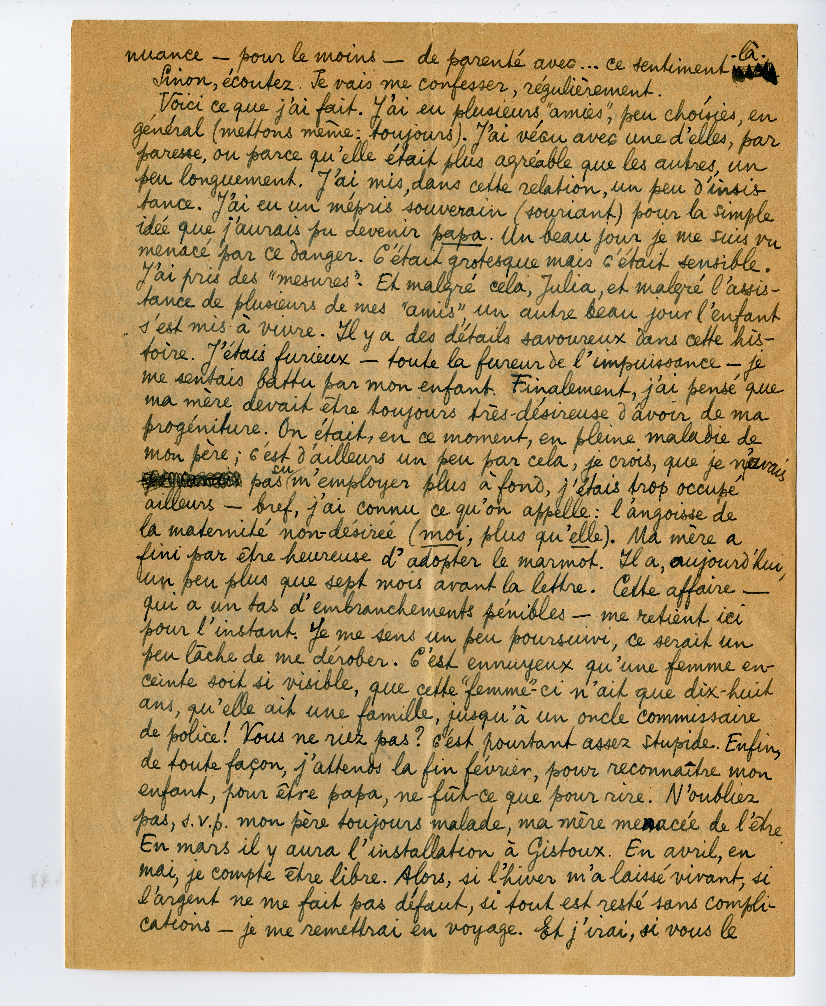 Voici ce que j'ai fait. J'ai eu plusieurs ‘amies’, peu choisies, en général (mettons même: toujours). J'ai vécu avec une d'elles, par paresse, ou parce qu'elle était plus agréable que les autres, un peu longuement. J'ai mis, dans cette relation, un peu d'insistance. J'ai eu un mépris souverain (souriant) pour la simple idée que j'aurais pu devenir papa. Un beau jour je me suis vu menacé par ce danger. C'était grotesque mais c'était sensible. J'ai pris des ‘mesures’. Et malgré cela, Julia, et malgré l'assistance de plusieurs de mes ‘amis’, un autre beau jour l'enfant s'est mis à vivre. Il y a des détails savoureux dans cette histoire. J'étais furieux - toute la fureur de l'impuissance - je me sentais battu par mon enfant. Finalement, j'ai pensé que ma mère devait être toujours très-désireuse d'avoir de ma progéniture. On était, en ce moment, en pleine maladie de mon père; c'est d'ailleurs un peu par cela, je crois, que je n'avais pas su m'employer plus à fond, j'étais trop occupé ailleurs - bref, j'ai connu ce qu'on appelle: l'angoisse de la maternité non-désirée (moi, plus qu'elle). Ma mère a fini par être heureuse d'adopter le marmot. Il a, aujourd'hui, un peu plus que sept mois avant la lettre. Cette affaire - qui a un tas d'embranchements pénibles - me retient ici pour l'instant. Je me sens un peu poursuivi, ce serait un peu lâche de me dérober. C'est ennuyeux qu'une femme enceinte soit si visible, que cette ‘femme’-ci n'ait que dix-huit ans, qu'elle ait une famille, jusqu'à un oncle commissaire de police! Vous ne riez pas? c'est pourtant assez stupide. Enfin, de toute façon, j'attends la fin février, pour reconnaître mon enfant, pour être papa, ne-fût-ce que pour rire. N'oubliez pas, s.v.p. mon père toujours malade, ma mère menacée de l'être. En mars il y aura l'installation à Gistoux. En avril, en mai, je compte être libre. Alors, si l'hiver m'a laissé vivant, si l'argent ne me fait pas défaut, si tout est resté sans complications - je me remettrai en voyage. Et j'irai, si vous le désirez toujours, vous voir.