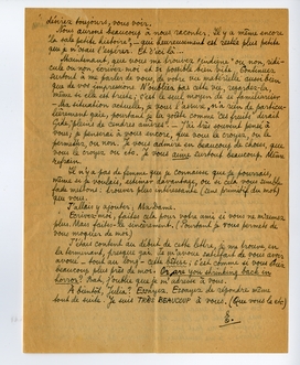 Maintenant, que vous me trouvez ‘indigne’ ou non, ridicule ou non, écrivez-moi et si possible bien vite. Continuez surtout à me parler de vous, de votre vie matérielle aussi bien que de vos impressions. N'oubliez pas cette vie, regardez-la, même si elle est triste; c'est le seul moyen de se familiariser. - Ma situation actuelle, je vous l'assure, n'a rien de particulièrement gaie, pourtant je la goûte comme ‘ces fruits’ dirait Gide, ‘pleins de cendres amères’. - J'ai très souvent pensé à vous; je penserai à vous encore, que vous le croyez, ou le permettez, ou non. Je vous admire en beaucoup de choses, que vous le croyez ou etc. Je vous aime surtout beaucoup. Même refrain.