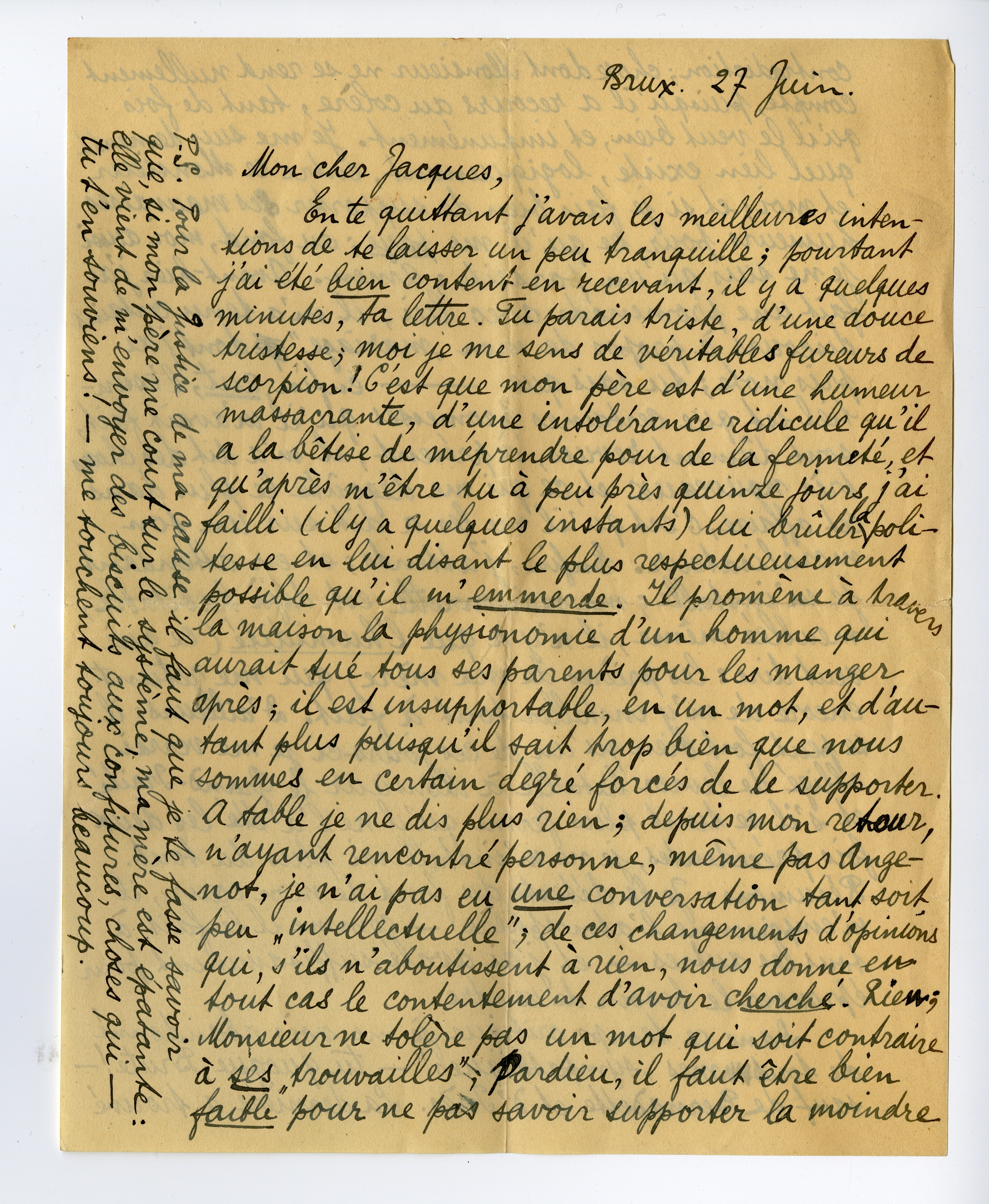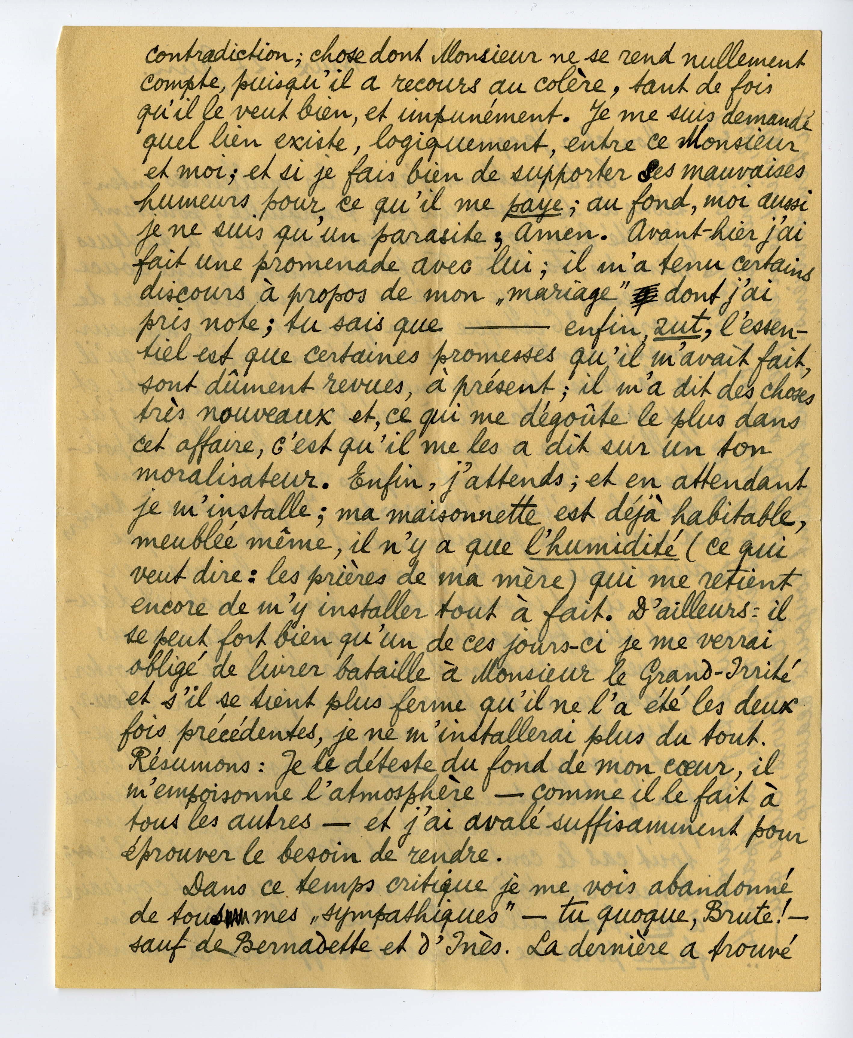 En te quittant j'avais les meilleures intentions de te laisser un peu tranquille; pourtant j'ai été bien content en recevant, il y a quelques minutes, ta lettre. Tu parais triste, d'une douce tristesse; moi je me sens de véritables fureurs de scorpion! C'est que mon père est d'une humeur massacrante, d'une intolérance ridicule qu'il a la bêtise de méprendre pour de la fermeté, et qu'après m'être tu à peu près quinze jours j'ai failli (il y a quelques instants) lui brûler la politesse en lui disant le plus respectueusement possible qu'il m'emmerde. Il promène à travers la maison la physionomie d'un homme qui aurait tué tous ses parents pour les manger après; il est insupportable, en un mot, et d'autant plus puisqu'il sait trop bien que nous sommes en certain degré forcés de le supporter. A table je ne dis plus rien; depuis mon retour, n'ayant rencontré personne, même pas Angenot, je n'ai pas eu une conversation tant soit, peu ‘intellectuelle’; de ces changements d'opinions qui, s'ils n'aboutissent à rien, nous donne en tout cas le contentement d'avoir cherché. Rien; Monsieur ne tolère pas un mot qui soit contraire à ses ‘trouvailles’; pardieu, il faut être bien faible pour ne pas savoir supporter la moindre contradiction; chose dont Monsieur ne se rend nullement compte, puisqu'il a recours au colère, tant de fois qu'il le veut bien, et impunément. Je me suis demandé quel lien existe, logiquement, entre ce Monsieur et moi; et si je fais bien de supporter ses mauvaises humeurs pour ce qu'il me paye; au fond, moi aussi je ne suis qu'un parasite; Amen. Avant-hier j'ai fait une promenade avec lui; il m'a tenu certains discours à propos de mon ‘mariage’ dont j'ai pris note; tu sais que - enfin, zut, l'essentiel est que certaines promesses qu'il m'avait fait, sont dûment revues, à présent; il m'a dit des choses très nouveaux et, ce qui me dégoûte le plus dans cet affaire, c'est qu'il me les a dit sur un ton moralisateur. Enfin, j'attends; et en attendant je m'installe; ma maisonnette est déjà habitable, meublée même, il n'y a que l'humidité (ce qui veut dire: les prières de ma mère) qui me retient encore de m'y installer tout à fait. D'ailleurs: il se peut fort bien qu'un de ces jours-ci je me verrai obligé de livrer bataille à Monsieur le Grand-Irrité et s'il se tient plus ferme qu'il ne l'a été les deux fois précédentes, je ne m'installerai plus du tout. Résumons: Je le déteste du fond de mon coeur, il m'empoisonne l'atmosphère -comme il le fait à tous les autres - et j'ai avalé suffisamment pour éprouver le besoin de rendre.