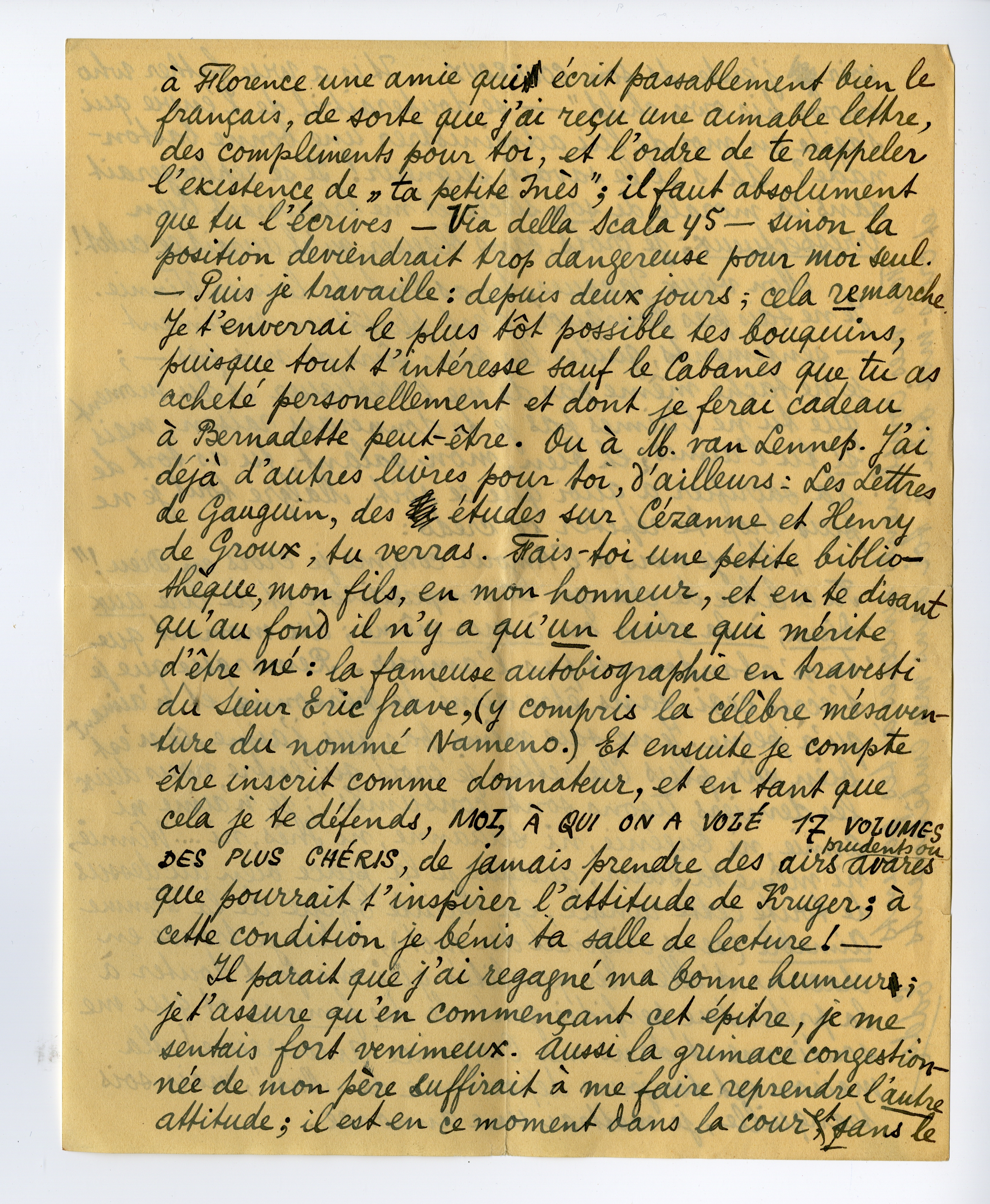 Dans ce temps critique je me vois abandonné de tous mes ‘sympathiques’ - tu quoque, Brute! - sauf de Bernadette et d'Inès. La dernière a trouvé à Florence une amie qui écrit passablement bien le français, de sorte que j'ai reçu une aimable lettre, des compliments pour toi, et l'ordre de te rappeler l'existence de ‘ta petite Inès’; il faut absolument que tu l'écrives - Via della Scala 45 - sinon la position deviendrait trop dangereuse pour moi seul. - Puis je travaille: depuis deux jours; cela remarche. Je t'enverrai le plus tôt possible tes bouquins, puisque tout t'intéresse sauf le Cabanès que tu as acheté personellement et dont je ferai cadeau à Bernadette peut-être. Ou à M. van Lennep. J'ai déjà d'autres livres pour toi, d'ailleurs: Les Lettres de Gauguin, des études sur Cézanne et Henry de Groux, tu verras. Fais-toi une petite bibliothèque, mon fils, en mon honneur, et en te disant qu'au fond il n'y a qu'un livre qui mérite d'être né: la fameuse autobiographie en travesti du Sieur Eric Grave, (y compris la célèbre mésaventure du nommé Nameno.) Et ensuite je compte être inscrit comme donnateur, et en tant que cela je te défends, MOI, À QUI ON A VOLÉ 17 VOLUMES DES PLUS CHÉRIS,