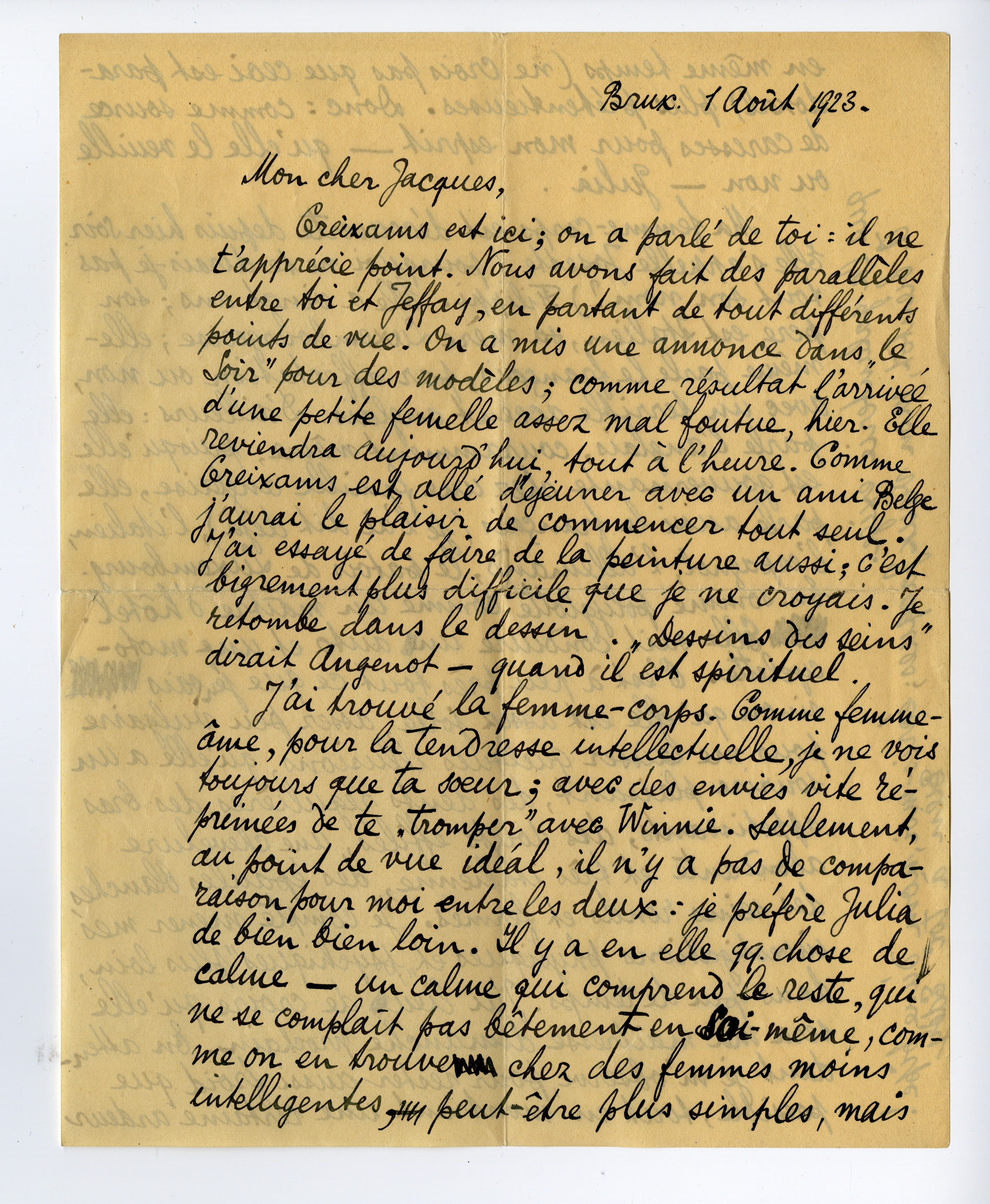 Creixams est ici; on a parlé de toi: il ne t'apprécie point. Nous avons fait des parallèles entre toi et Jeffay, en partant de tout différents points de vue. On a mis une annonce dans Le Soir pour des modèles; comme résultat l'arrivée d'une petite femelle assez mal foutue, hier. Elle reviendra aujourd'hui, tout à l'heure. Comme Creixams est allé déjeuner avec un ami Belge j'aurai le plaisir de commencer tout seul. J'ai essayé de faire de la peinture aussi; c'est bigrement plus difficile que je ne croyais. Je retombe dans le dessin. ‘Dessins des seins’ dirait Angenot - quand il est spirituel.