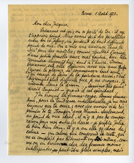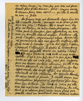 J'ai trouvé la femme-corps. Comme femme-âme, pour la tendresse intellectuelle, je ne vois toujours que ta soeur; avec des envies vite réprimées de te ‘tromper’ avec Winnie. Seulement, au point de vue idéal, il n'y a pas de comparaison pour moi entre les deux: je préferè Julia de bien bien loin. Il y a en elle qq. chose de calme - un calme qui comprend le reste, qui ne se complaît pas bêtement en soi-même, comme on en trouve chez des femmes moins intelligentes, peut-être plus simples, mais en même temps (ne crois pas que ceci est paradoxal) plus prétentieuses. Donc: comme source de caresses pour mon esprit - qu'elle le veuille ou non - Julia.
