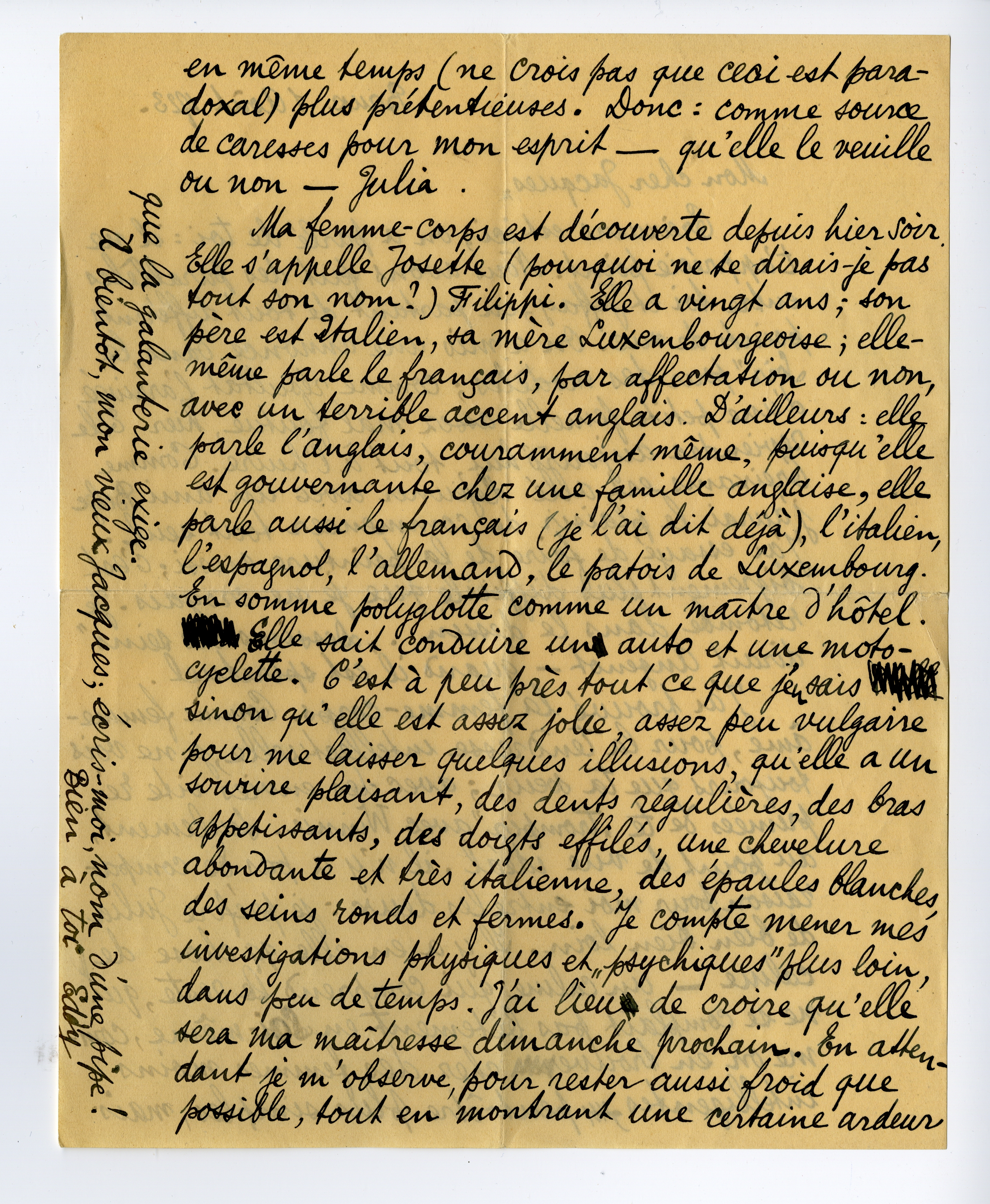 Ma femme-corps est découverte depuis hier soir. Elle s'appelle Josette (pourquoi ne te dirais-je pas tout son nom?) Filippi. Elle a vingt ans; son père est Italien, sa mère Luxembourgeoise; elle-même parle le français, par affectation ou non, avec un terrible accent anglais. D'ailleurs: elle parle l'anglais, couramment même, puisqu'elle est gouvernante chez une famille anglaise, elle parle aussi le français (je l'ai dit déjà), l'italien, l'espagnol, l'allemand, le patois de Luxembourg. En somme polyglotte comme un maître d'hôtel.