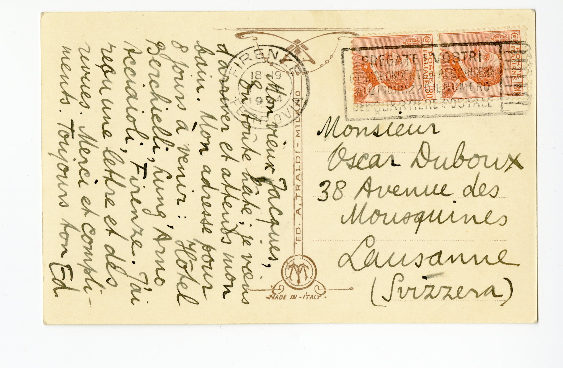 En toûte hâte; je viens d'arriver et attends mon bain. Mon adresse pour 8 jours à venir: Hôtel Berchielli, Lung'Arno Acciaioli, Firenze. J'ai reçu une lettre et des revues. Merci et compliments. Toujours ton