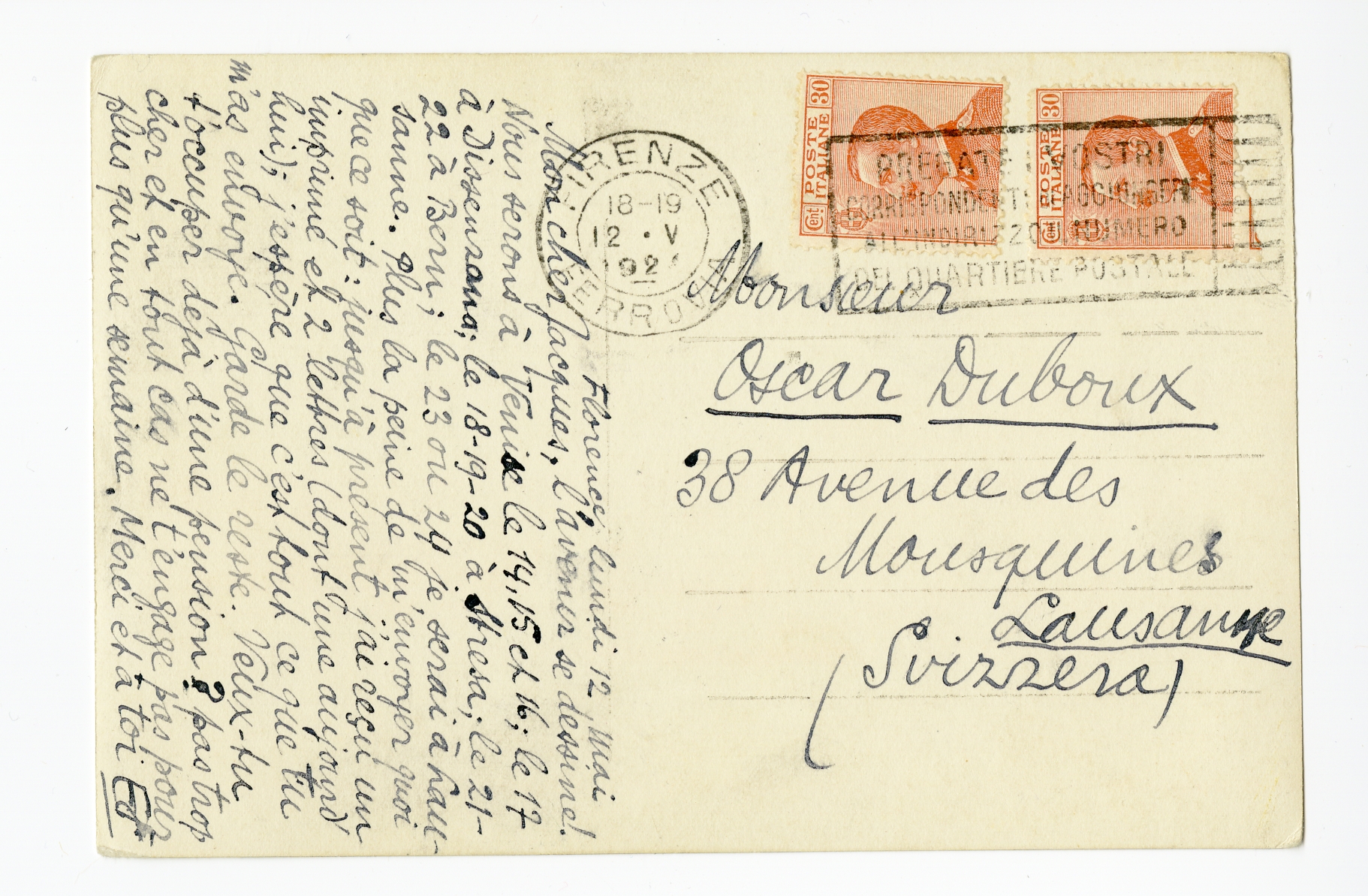 l'avenir se dessine! Nous serons à Venise le 14, 15 et 16; le 17 à Dissenzana; le 18-19-20 à Stresa; le 21-22 à Bern; le 23 ou 24 je serai à Lausanne. Plus la peine de m'envoyer quoi que ce soit: jusqu'à présent j'ai reçu un imprimé et 2 lettres (dont une aujourd'hui); j'espère que c'est tout ce que tu m'as envoyé. Garde le reste. Veux-tu t'occuper déjà d'une pension? pas trop cher et en tout cas ne t'engage pas pour plus qu'une semaine. Merci et à toi