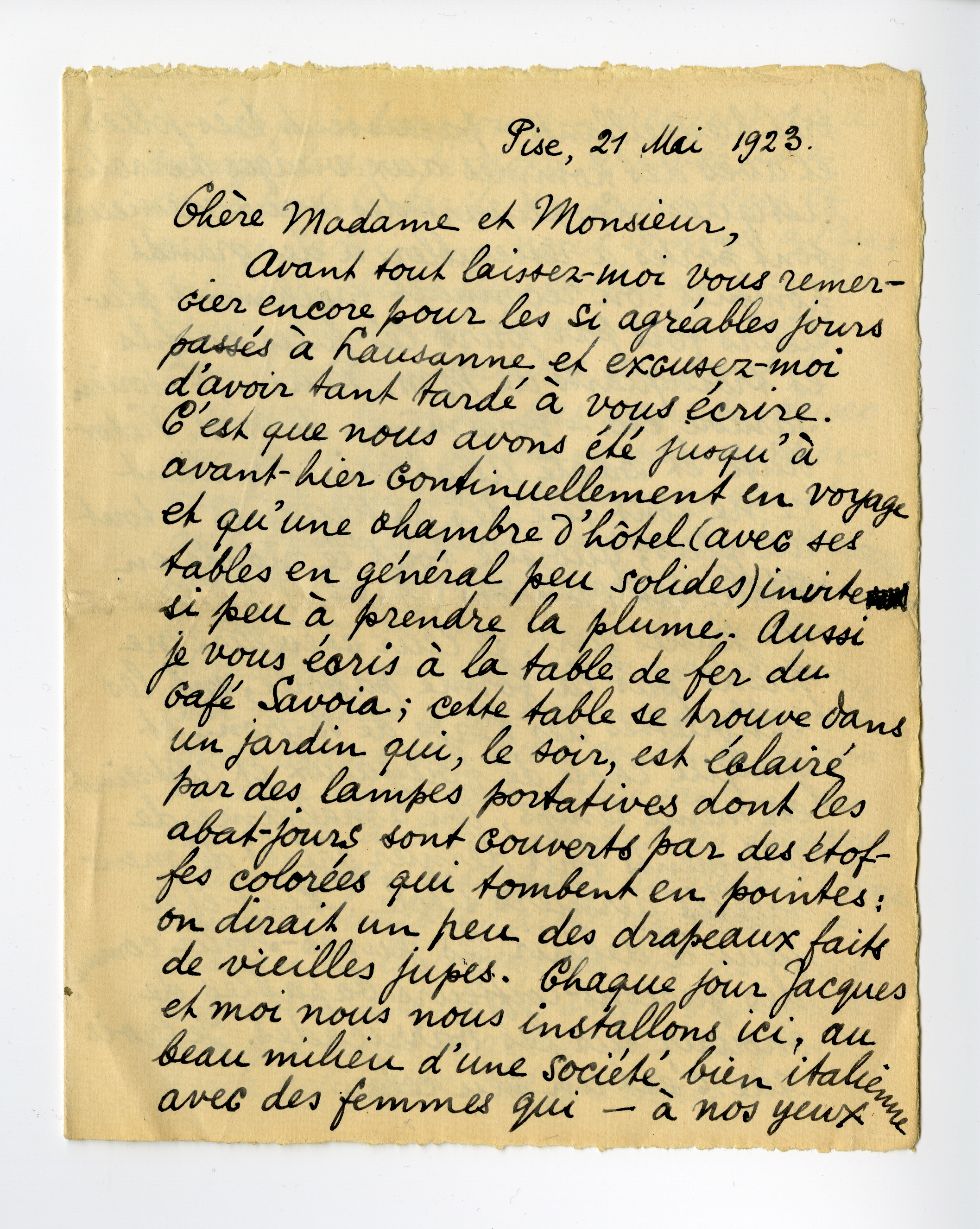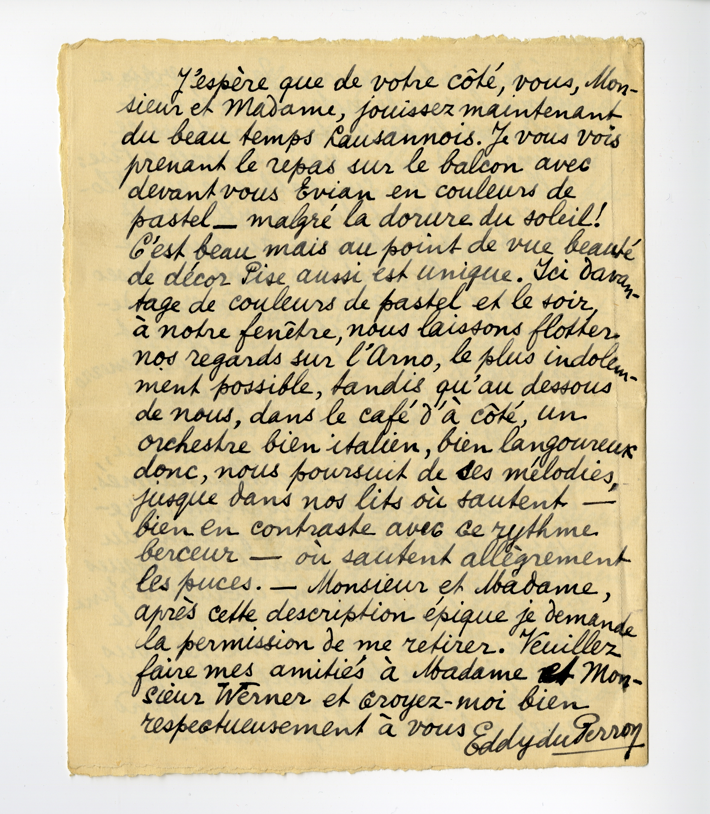 J'espère que de votre côté, vous, Monsieur et Madame, jouissez maintenant du beau temps Lausannois. Je vous vois prenant le repas sur le balcon avec devant vous Evian en couleurs de pastel - malgré la dorure du soleil! C'est beau mais au point de vue beauté de décor Pise aussi est unique. Ici davantage de couleurs de pastel et le soir, à notre fenêtre, nous laissons flotter nos regards sur l'Arno, le plus indolemment possible, tandis qu'au dessous de nous, dans le café d'à côté, un orchestre bien italien, bien langoureux donc, nous poursuit de ses mélodies, jusque dans nos lits où sautent - bien en contraste avec ce rythme berceur - où sautent allègrement les puces. - Monsieur et Madame, après cette description épique je demande la permission de me retirer. Veuillez faire mes amitiés à Madame et Monsieur Werner et croyez-moi bien respectueusement à vous