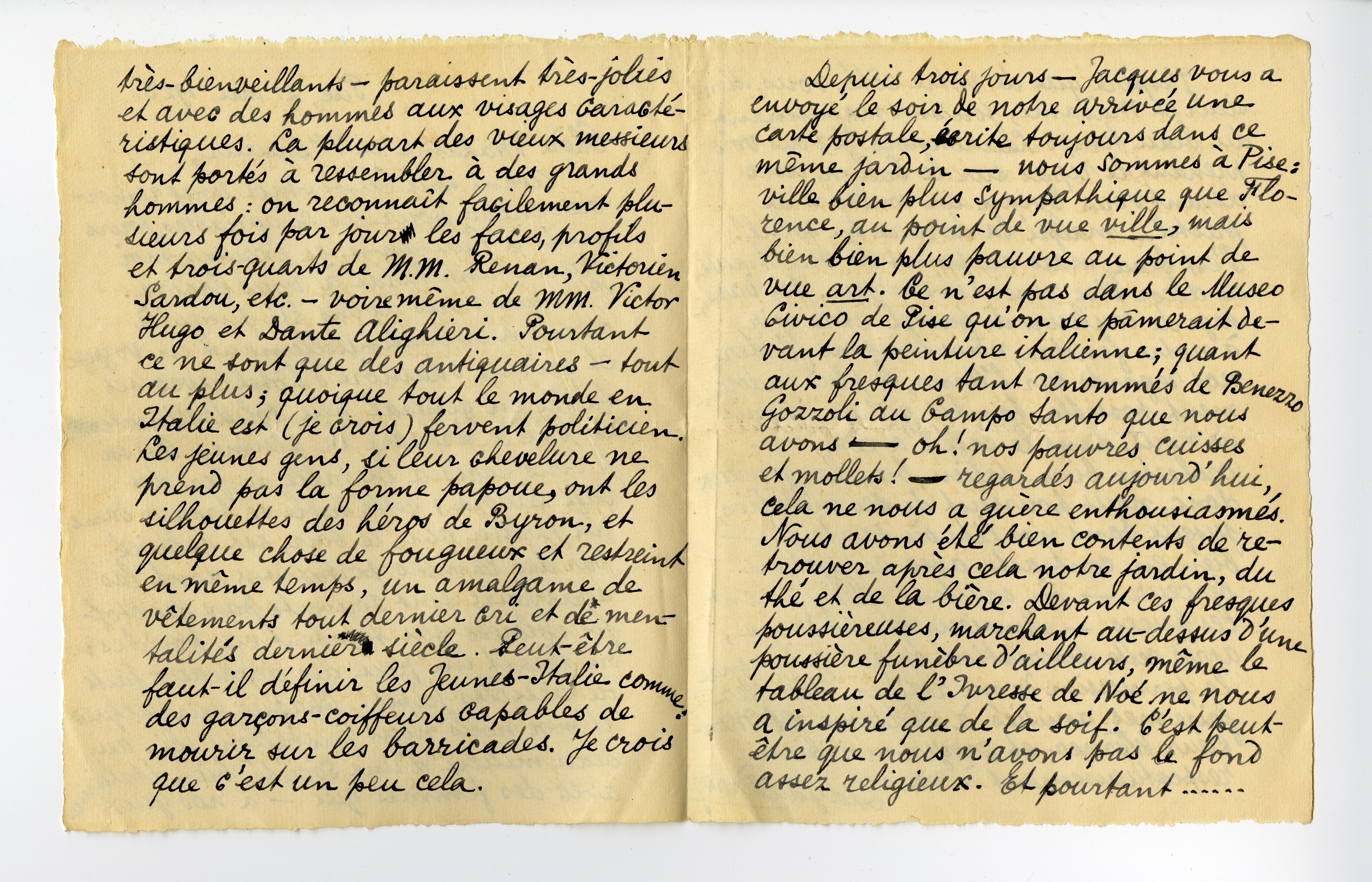 Depuis trois jours - Jacques vous a envoyé le soir de notre arriveé une carte postale, écrite toujours dans ce même jardin - nous sommes à Pise: ville bien plus sympathique que Florence, au point de vue ville, mais bien bien plus pauvre au point de vue art. Ce n'est pas dans le Museo Civico de Pise qu'on se pâmerait devant la peinture italienne; quant aux fresques tant renommés de Benezzo Gozzoli au Campo Santo que nous avons - oh! nos pauvres cuisses et mollets! - regardés aujourd'hui, cela ne nous a guère enthousiasmés. Nous avons été bien contents de retrouver après cela notre jardin, du thé et de la bière. Devant ces fresques poussièreuses, marchant au-dessus d'une poussière funèbre d'ailleurs, même le tableau de l'Ivresse de Noé ne nous a inspiré que de la soif. C'est peut-être que nous n'avons pas le fond assez religieux. Et pourtant....