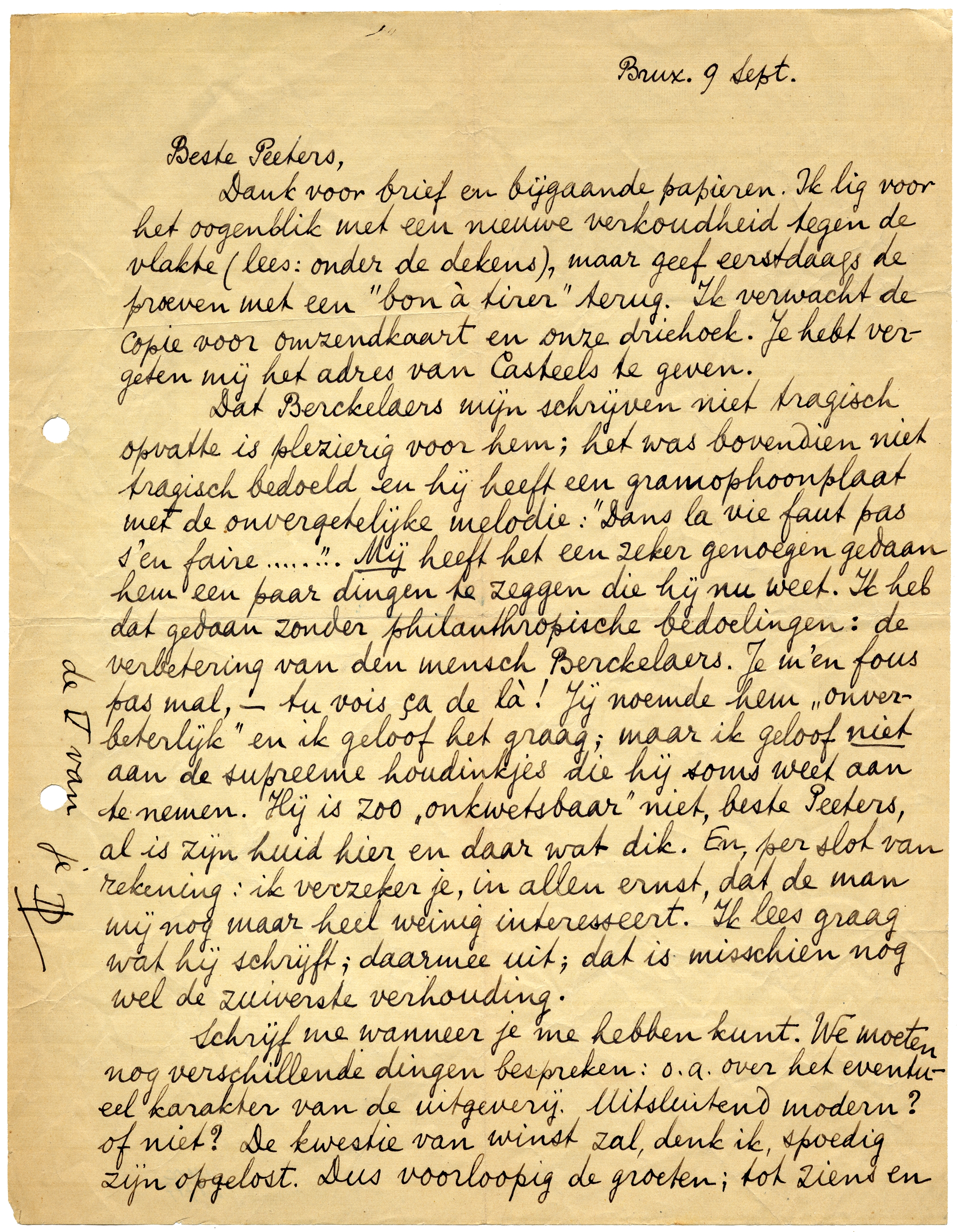 Dat Berckelaers mijn schrijven niet tragisch opvatte is plezierig voor hem; het was bovendien niet tragisch bedoeld en hij heeft een gramophoonplaat met de onvergetelijke melodie: ‘Dans la vie faut pas s’ en faire…’ Mij heeft het een zeker genoegen gedaan hem een paar dingen te zeggen die hij nu weet. Ik heb dat gedaan zonder philanthropische bedoelingen: de verbetering van den mensch Berckelaers. Je m’en fous pas mal, - tu vois ça de là! Jij noemde hem ‘onverbeterlijk’ en ik geloof het graag; maar ik geloof niet aan de supreeme houdinkjes die hij soms weet aan te nemen. Hij is zoo ‘onkwetsbaar’ niet, beste Peeters, al is zijn huid hier en daar wat dik. En, per slot van rekening: ik verzeker je, in allen ernst, dat de man mij nog maar heel weinig interesseert. Ik lees graag wat hij schrijft; daarmee uit; dat is misschien nog wel de zuiverste verhouding.