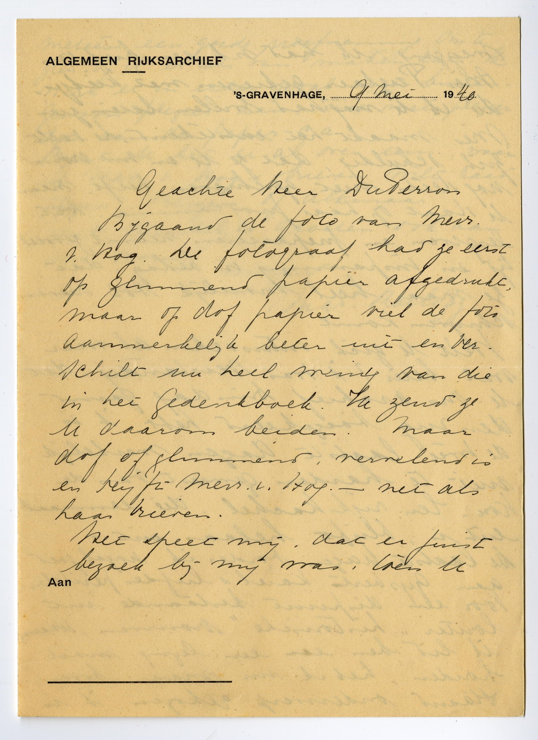Bijgaand de foto van Mevr. v. Hog. De fotograaf had ze eerst op glimmend papier afgedrukt, maar op dof papier viel de foto aanmerkelijk beter uit en verschilt nu heel weinig van die in het Gedenkboek. Ik zend ze U daarom beiden. Maar dof of glimmend, vervelend is en blijft Mevr. v. Hog. - net als haar brieven.