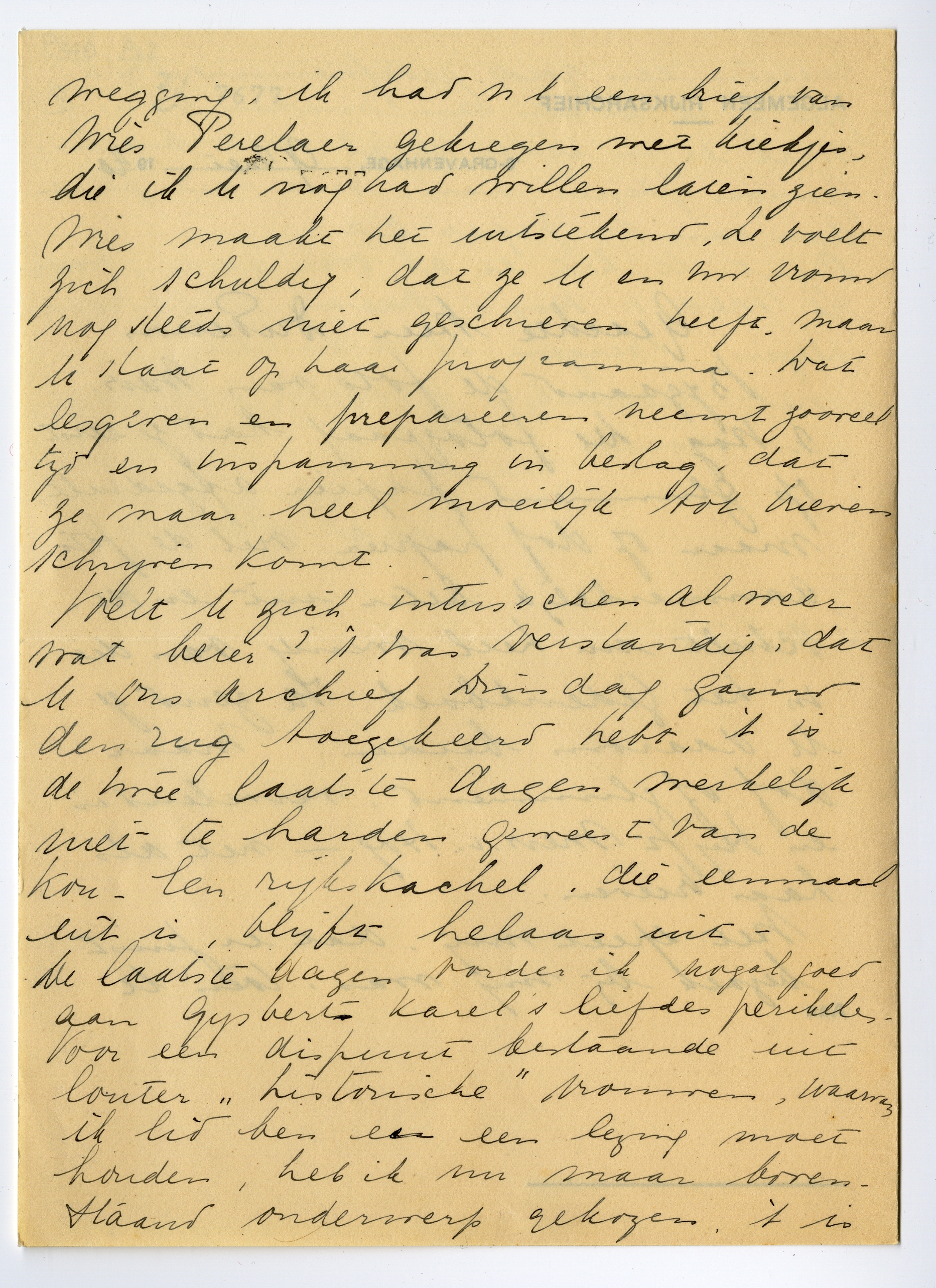 Voelt U zich intusschen al weer wat beter? ’t Was verstandig, dat U ons archief Dinsdag gans den rug toegekeerd hebt, ’t is de twee laatste dagen werkelijk niet te harden geweest van de kou - Een rijkskachel, die eenmaal uit is, blijft helaas uit - De laatste dagen vorder ik nogal goed aan Gijsbert Karel’s liefdes perikelen. Voor een dispuut bestaande uit louter ‘historische’ vrouwen, waarvan ik lid ben en een lezing moet houden, heb ik nu maar bovenstaand onderwerp gekozen, ’t is meteen een goede proefneming om te zien of ik er iets van maken kan. Ik werk er in ieder geval met buitengewoon plezier aan, met meer plezier dan aan de peper c.a.