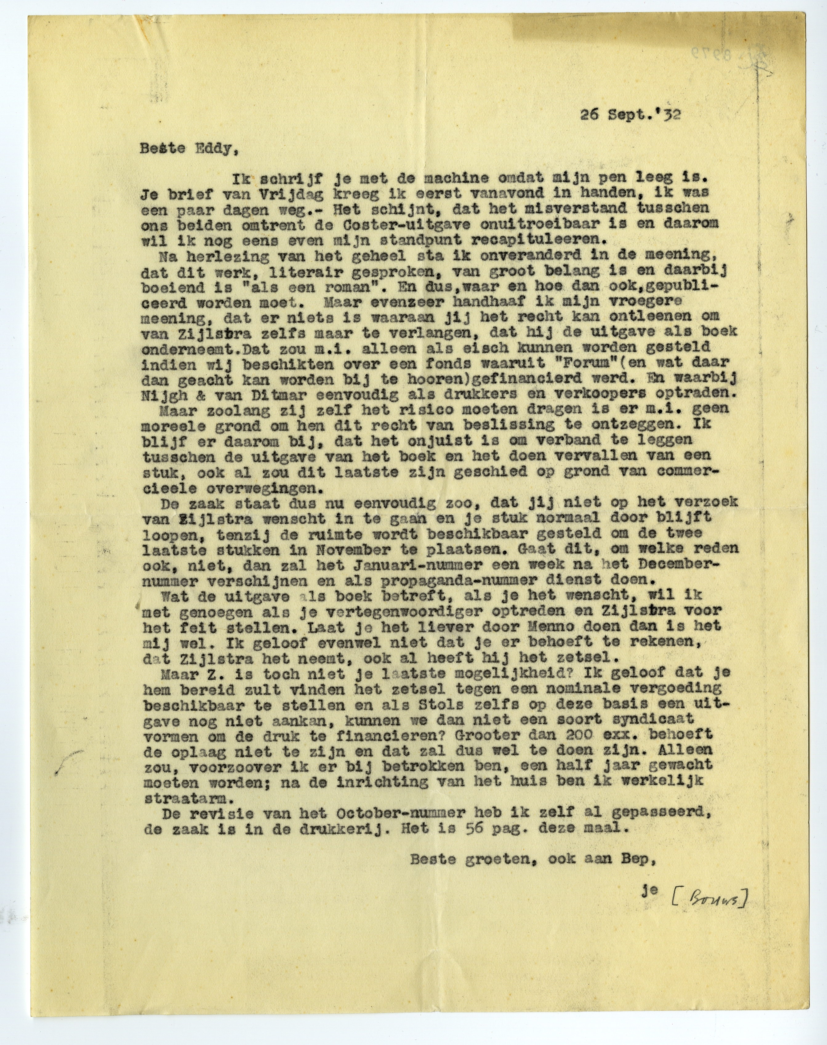 Ik schrijf je met de machine omdat mijn pen leeg is. Je brief van Vrijdag kreeg ik eerst vanavond in handen, ik was een paar dagen weg.- Het schijnt, dat het misverstand tusschen ons beiden omtrent de Coster-uitgave onuitroeibaar is en daarom wil ik nog eens even mijn standpunt recapituleeren.
