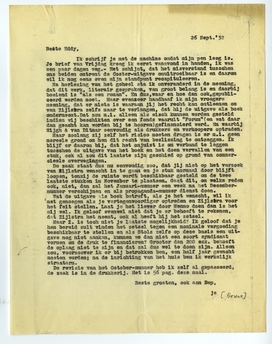 Maar Z. is toch niet je laatste mogelijkheid? Ik geloof dat je hem bereid zult vinden het zetsel tegen een nominale vergoeding beschikbaar te stellen en als Stols zelfs op deze basis een uitgave nog niet aankan, kunnen we dan niet een soort syndicaat vormen om de druk te financieren? Grooter dan 200 exx. behoeft de oplaag niet te zijn en dat zal dus wel te doen zijn. Alleen zou, voorzoover ik er bij betrokken ben, een half jaar gewacht moeten worden; na de inrichting van het huis ben ik werkelijk straatarm.