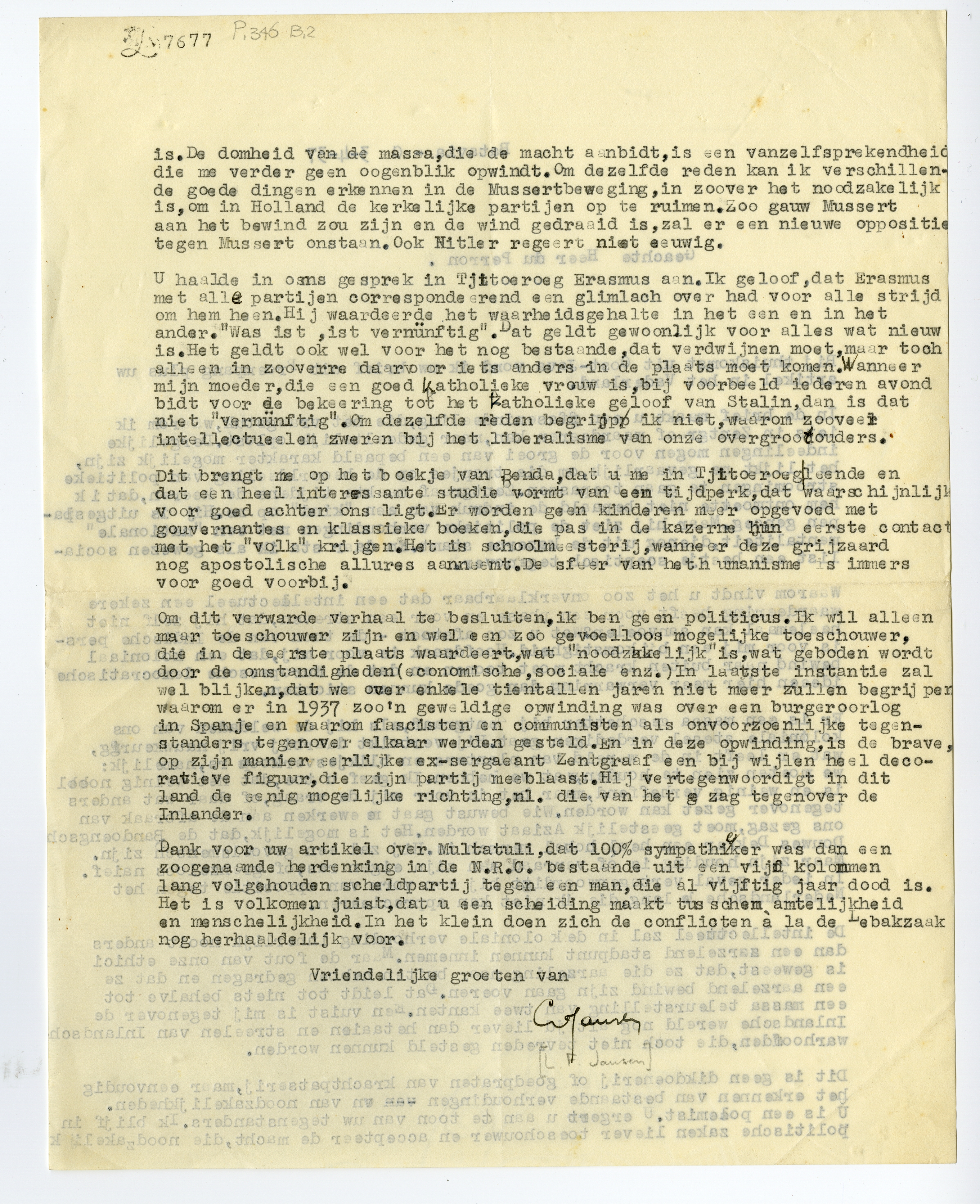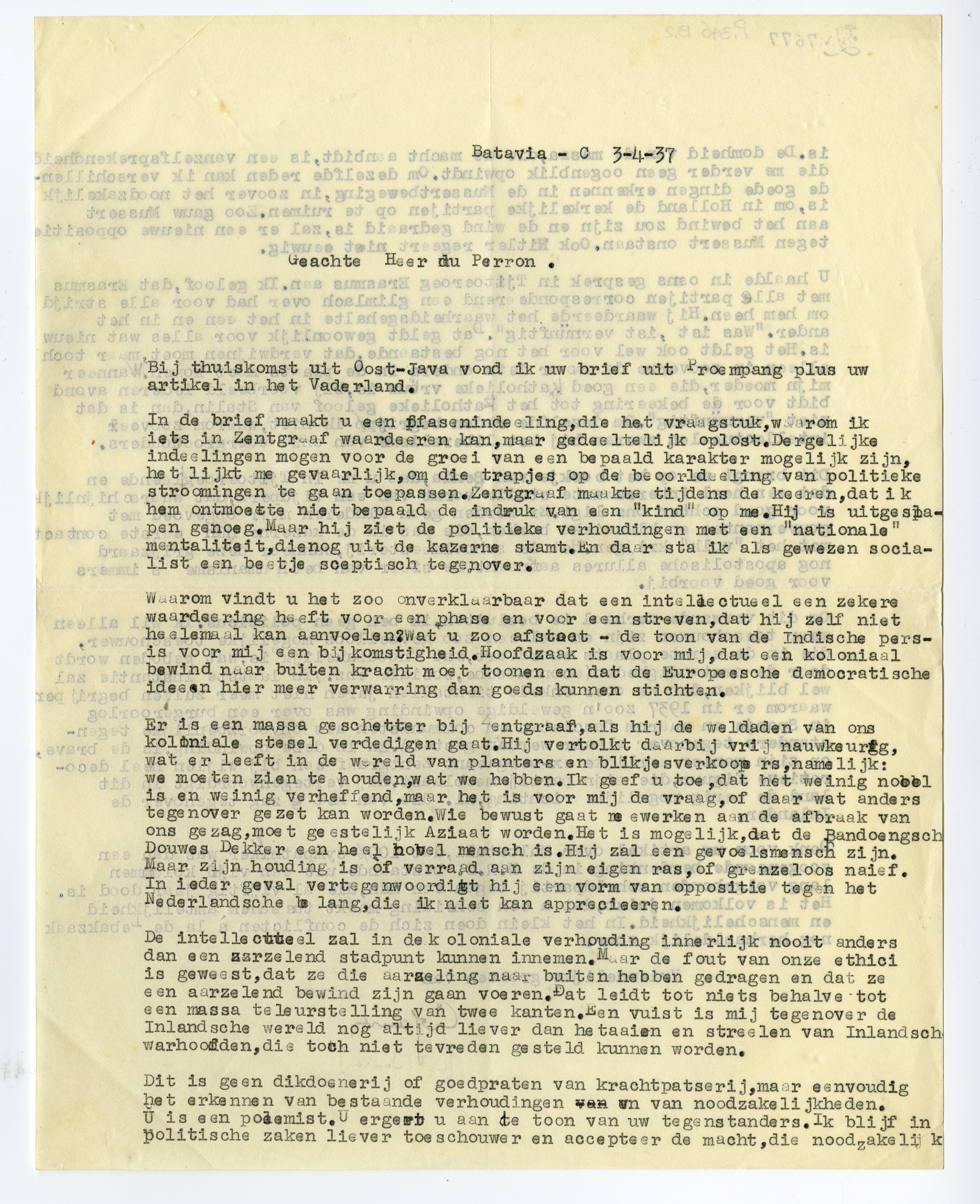 Er is een massa geschetter bij Zentgraaf, als hij de weldaden van ons koloniale ste[l]sel verdedigen gaat. Hij vertolkt daarbij vrij nauwkeurig, wat er leeft in de wereld van planters en blikjesverkoopers, namelijk: we moeten zien te houden, wat we hebben. Ik geef u toe, dat het weinig nobel is en weinig verheffend, maar het is voor mij de vraag, of daar wat anders tegenover gezet kan worden. Wie bewust gaat meewerken aan de afbraak van ons gezag, moet geestelijk Aziaat worden. Het is mogelijk dat de Bandoengsch Douwes Dekker een heel nobel mensch is. Hij zal een gevoelsmensch zijn. Maar zijn houding is òf verraad aan zijn eigen ras, of grenzeloos naief. In ieder geval vertegenwoordigt hij een vorm van oppositie tegen het Nederlandsche belang, die ik niet kan apprecieeren.