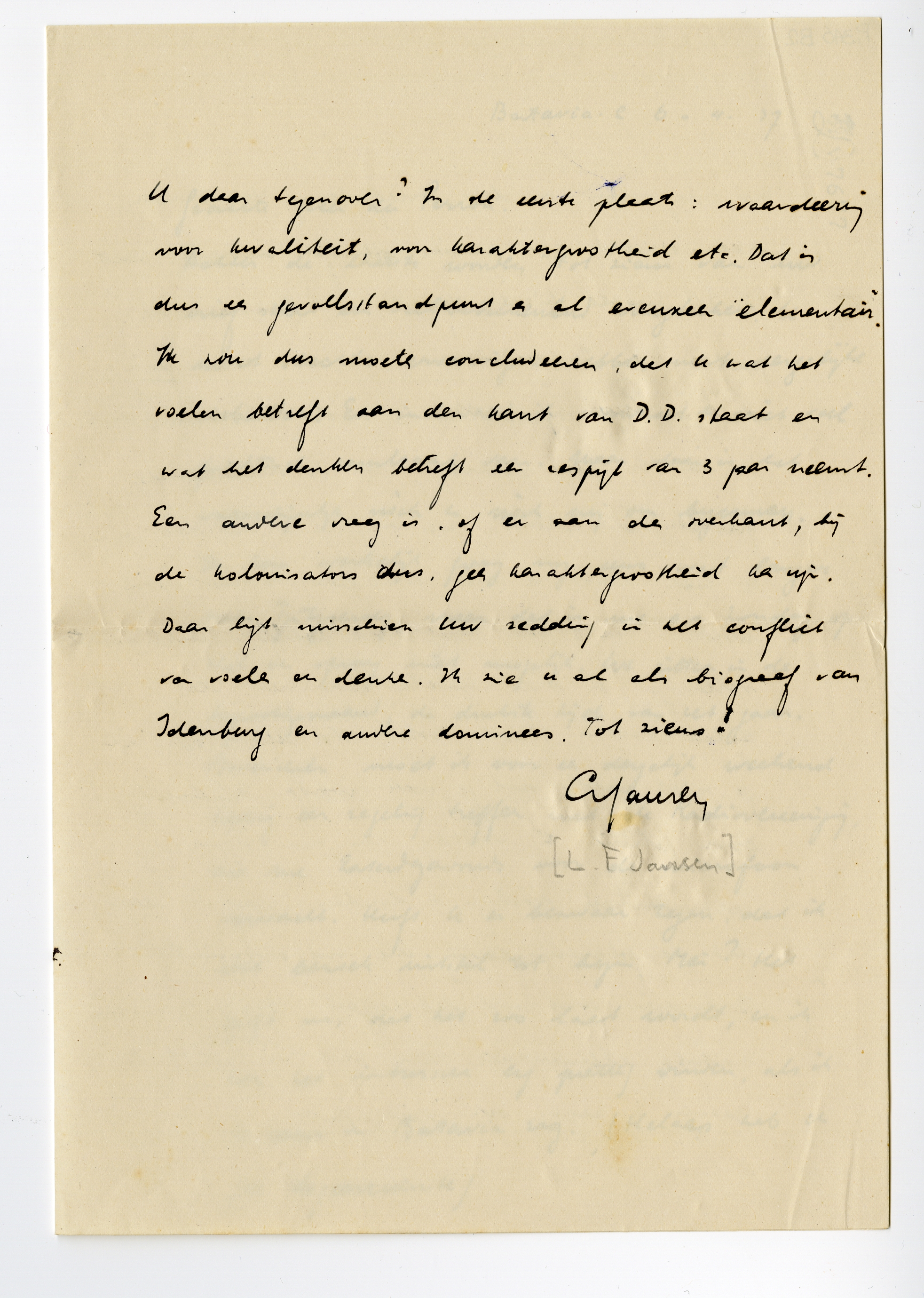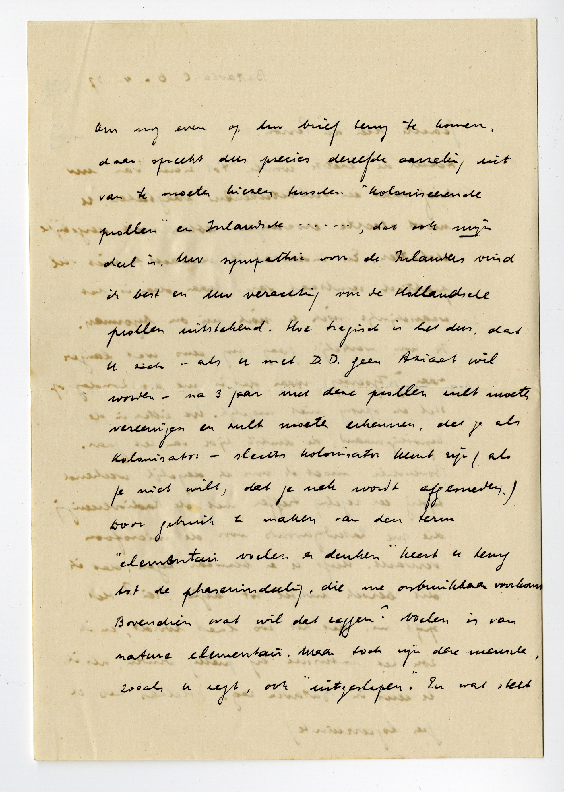 Om nog even op Uw brief terug te komen, daar spreekt dus precies dezelfde aarzeling uit van te moeten kiezen tusschen ‘koloniseerende prollen‘ en Inlandsche ....... , dat ook mijn deel is. Uw sympathie voor de Inlanders vind ik best en uw verachting van de Hollandsche prollen uitstekend. Hoe tragisch is het dus, dat U zich – als u met D.D. geen Aziaat wil worden – na 3 jaar met deze prollen zult moeten vereenigen en zult moeten erkennen, dat je als kolonisator – slechts kolonisator kunt zijn (als je niet wilt, dat je nek wordt afgesneden.) Door gebruik te maken van den term ‘elementair voelen en denken’ keert u terug tot de phasenindeling, die me onbruikbaar voorkomt. Bovendien wat wil dat zeggen? Voelen is van nature elementair, maar toch zijn deze menschen, zooals u zegt, ook ‘uitgeslapen’. En wat stelt U daar tegenover? In de eerste plaats: waardeering voor kwaliteit, voor karaktergrootheid etc. Dat is dus een gevoelsstandpunt en al evenzeer ‘elementair’. Ik zou dus moeten concluderen, dat U wat het voelen betreft aan den kant van D.D. staat en wat het denken betreft een respijt van 3 jaar neemt. Een andere vraag is, of er aan de overkant, bij de kolonisators dus, geen karaktergrootheid kan zijn. Daar ligt misschien Uw redding in het conflict van voelen en denken. Ik zie u al als biograaf van Idenburg en andere dominees. Tot ziens!