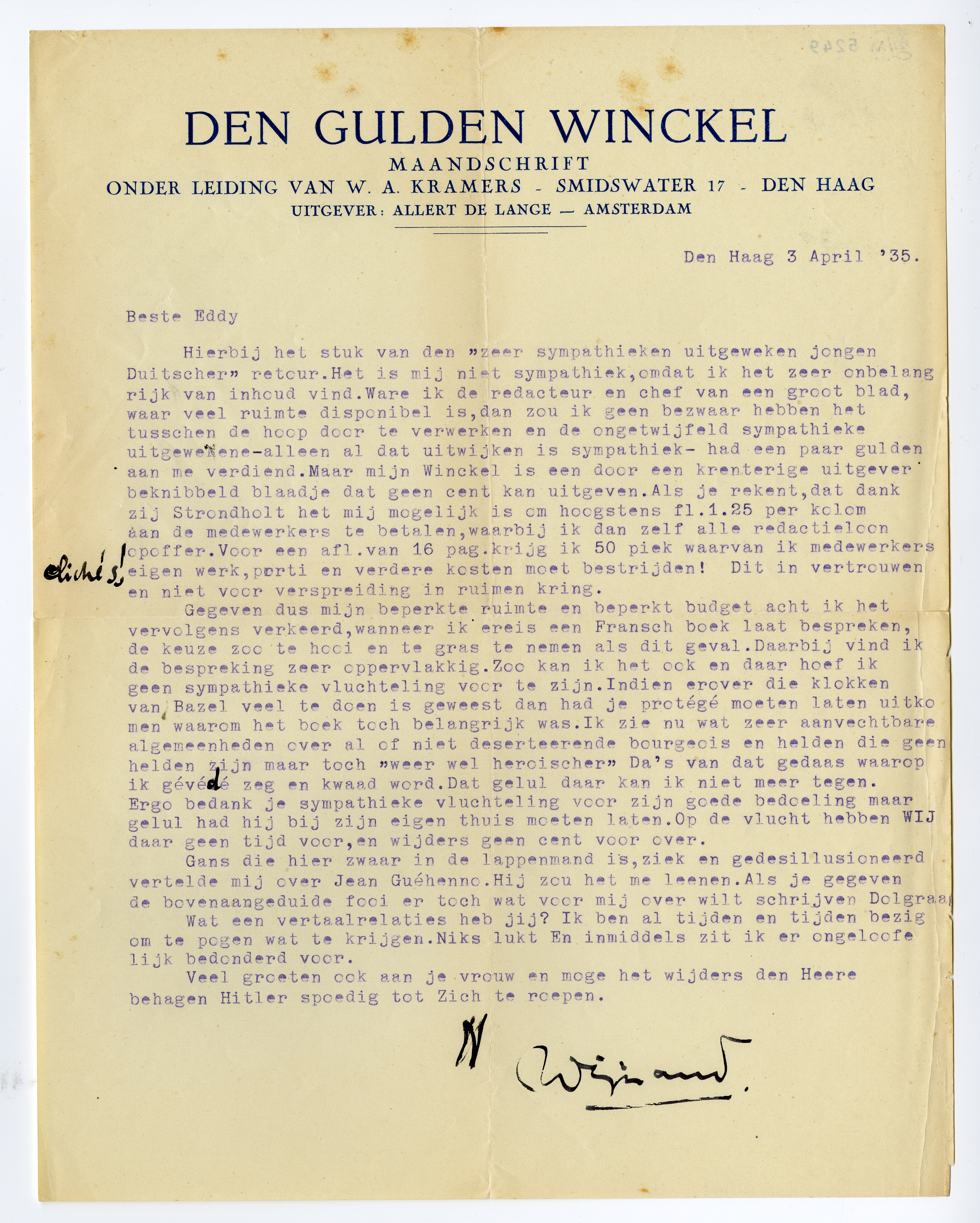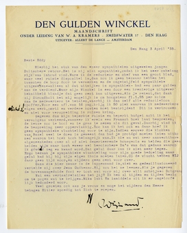 Hierbij het stuk van den ‘zeer sympathieken uitgeweken jongen Duitscher’ retour. Het is mij niet sympathiek, omdat ik het zeer onbelangrijk van inhoud vind. Ware ik de redacteur en chef van een groot blad, waar veel ruimte disponibel is, dan zou ik geen bezwaar hebben het tusschen de hoop door te verwerken en de ongetwijfeld sympathieke uitgewekene - alleen al dat uitwijken is sympathiek – had een paar gulden aan me verdiend. Maar mijn >Winckel is een door een krenterige uitgever beknibbeld blaadje dat geen cent kan uitgeven. Als je rekent, dat dank zij Strondholt het mij mogelijk is om hoogstens fl.1.25 per kolom aan de medewerkers te betalen, waarbij ik dan zelf alle redactieloon opoffer. Voor een afl. van 16 pag. krijg ik 50 piek waarvan ik medewerkers, clichés, eigen werk, porti en verdere kosten moet bestrijden! Dit in vertrouwen en niet voor verspreiding in ruimen kring.
