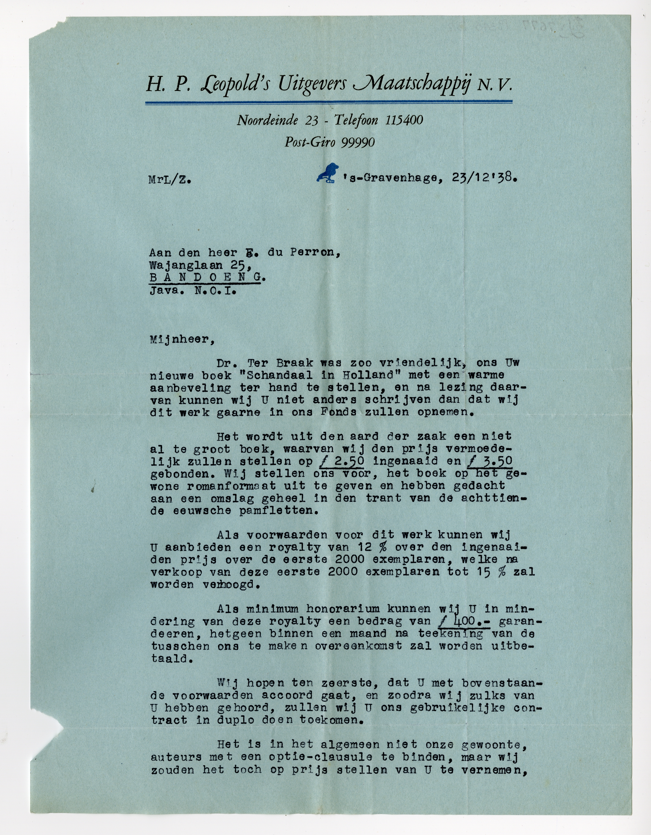 Als voorwaarden voor dit werk kunnen wij U aanbieden een royalty van 12% over den ingenaaiden prijs over de eerste 2000 exemplaren, welke na verkoop van deze eerste 2000 exemplaren tot 15 % zal worden verhoogd.