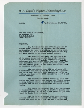 Het is in het algemeen niet onze gewoonte, auteurs met een optie-clausule te binden, maar wij zouden het toch op prijs stellen van U te vernemen, dat U, onvoorziene omstandigheden voorbehouden, de beide volgende boeken, die U in deze reeks denkt te schrijven, in de eerste plaats aan ons zult aanbieden.