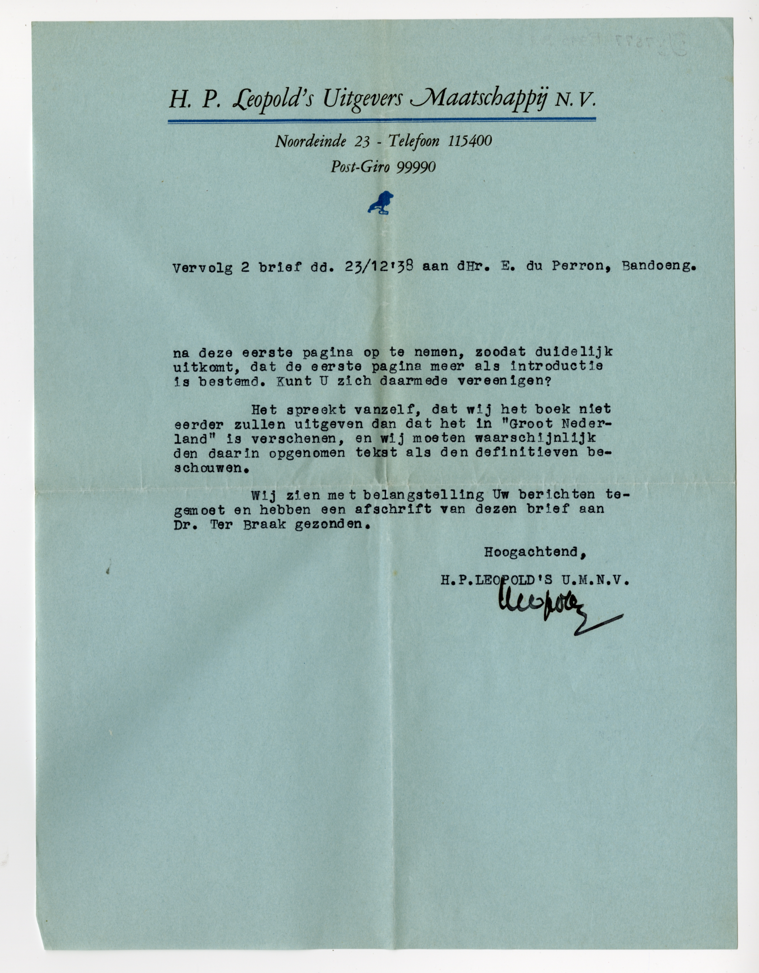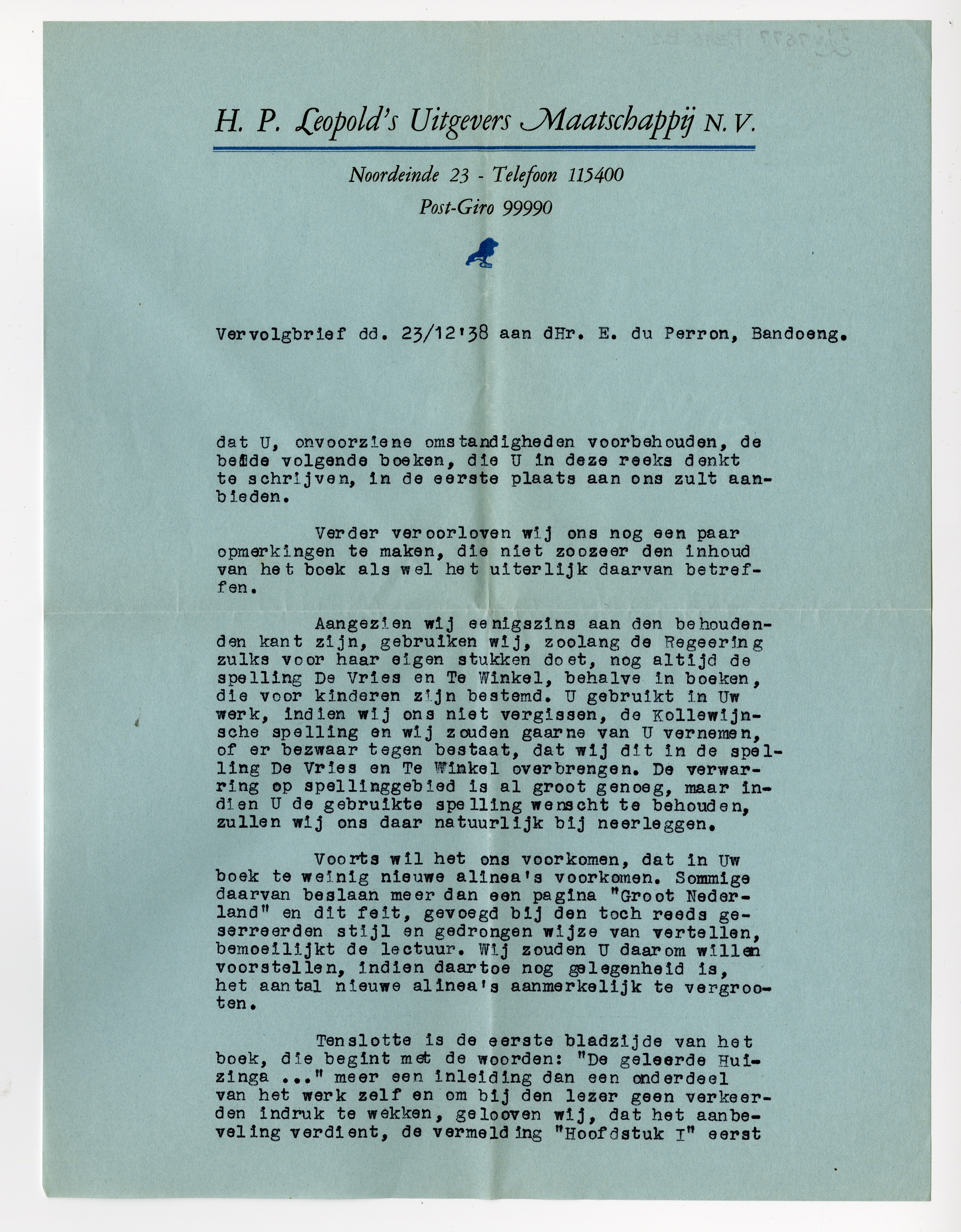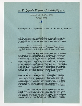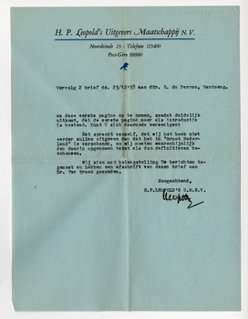 Aangezien wij eenigszins aan den behoudenden kant zijn, gebruiken wij, zoolang de Regeering zulks voor haar eigen stukken doet, nog altijd de spelling De Vries en Te Winkel, behalve in boeken, die voor kinderen zijn bestemd. U gebruikt in Uw werk, indien wij ons niet vergissen, de Kollewijnsche spelling en wij zouden gaarne van U vernemen, of er bezwaar tegen bestaat, dat wij dit in de spelling De Vries en Te Winkel overbrengen. De verwarring op spellinggebied is al groot genoeg, maar indien U de gebruikte spelling wenscht te behouden, zullen wij ons daar natuurlijk bij neerleggen.