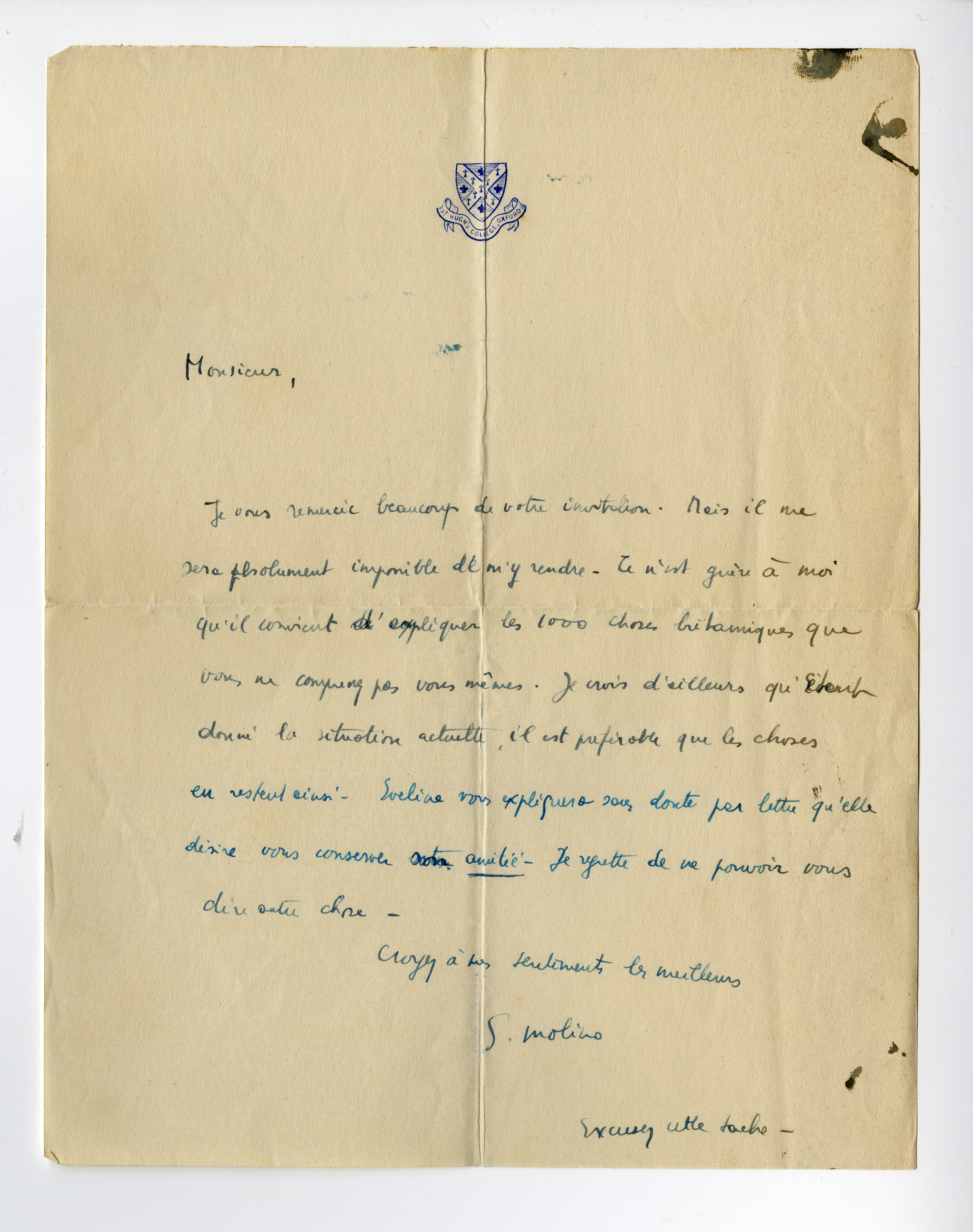 Je vous remercie beaucoup de votre invitation. Mais il me sera probablement impossible de m'y rendre. Ce n'est guère moi qu'il convient d'expliquer les 1000 choses britanniques que vous ne comprenez pas vous mêmes. Je crois d'ailleurs qu'étant donnée* la situation actuelle, il est préférable que les choses en restent ainsi. Eveline vous expliquera sans doute par lettre qu'elle désire vous conserver amitié - Je regrette de ne pouvoir vous dire autre chose -