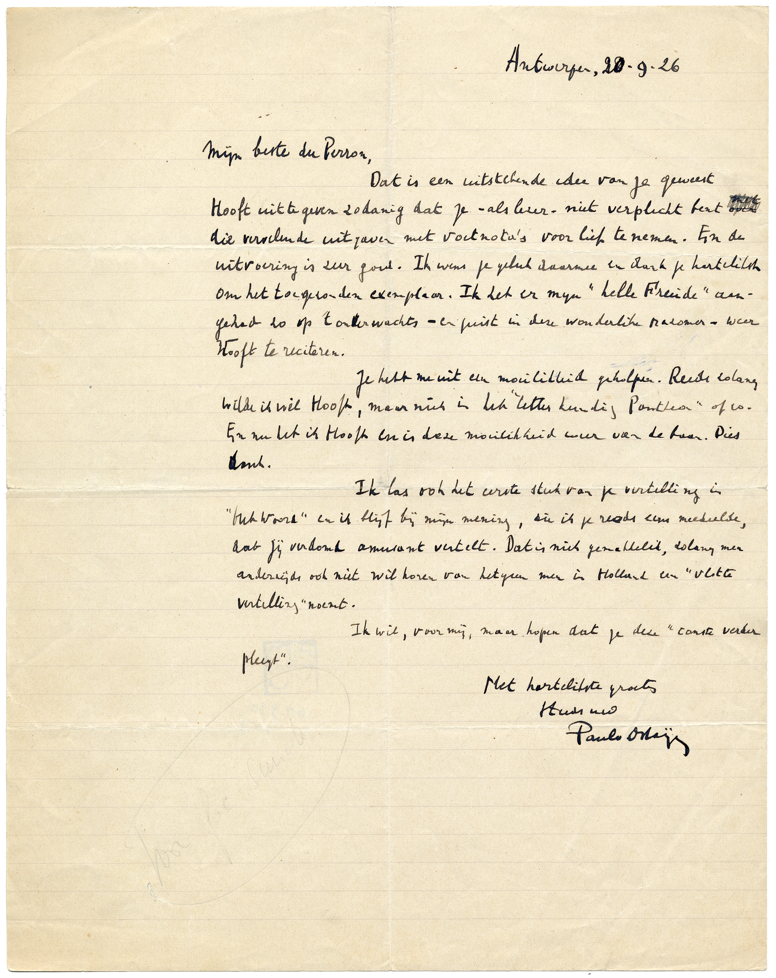 Je hebt me uit een moeilikheid geholpen. Reeds zolang wilde ik wél Hooft, maar niet in het ‘letterkundig pantheon’ of zo. En nu heb ik Hooft en is deze moeilikheid weer [van] de baan. Dus dank.