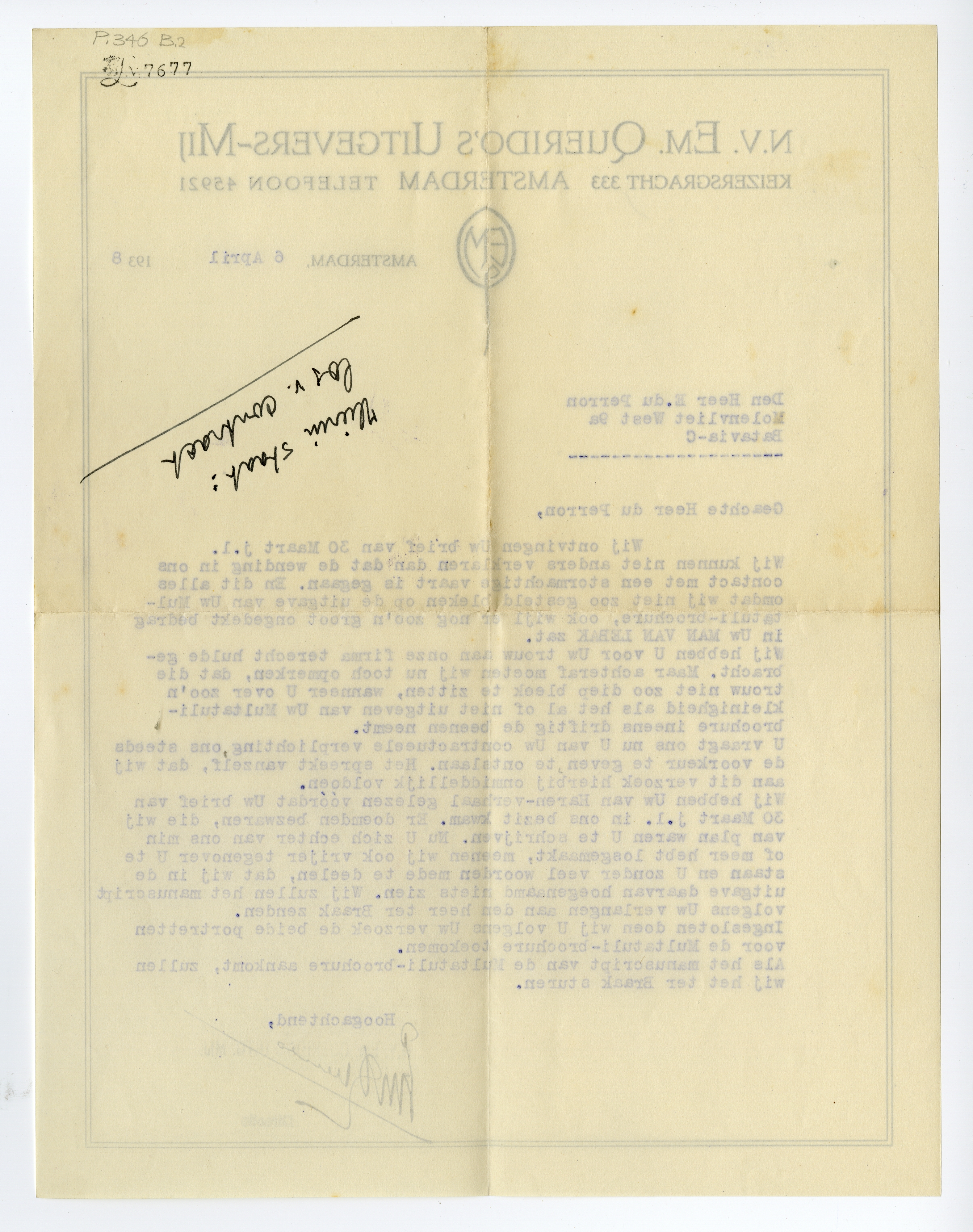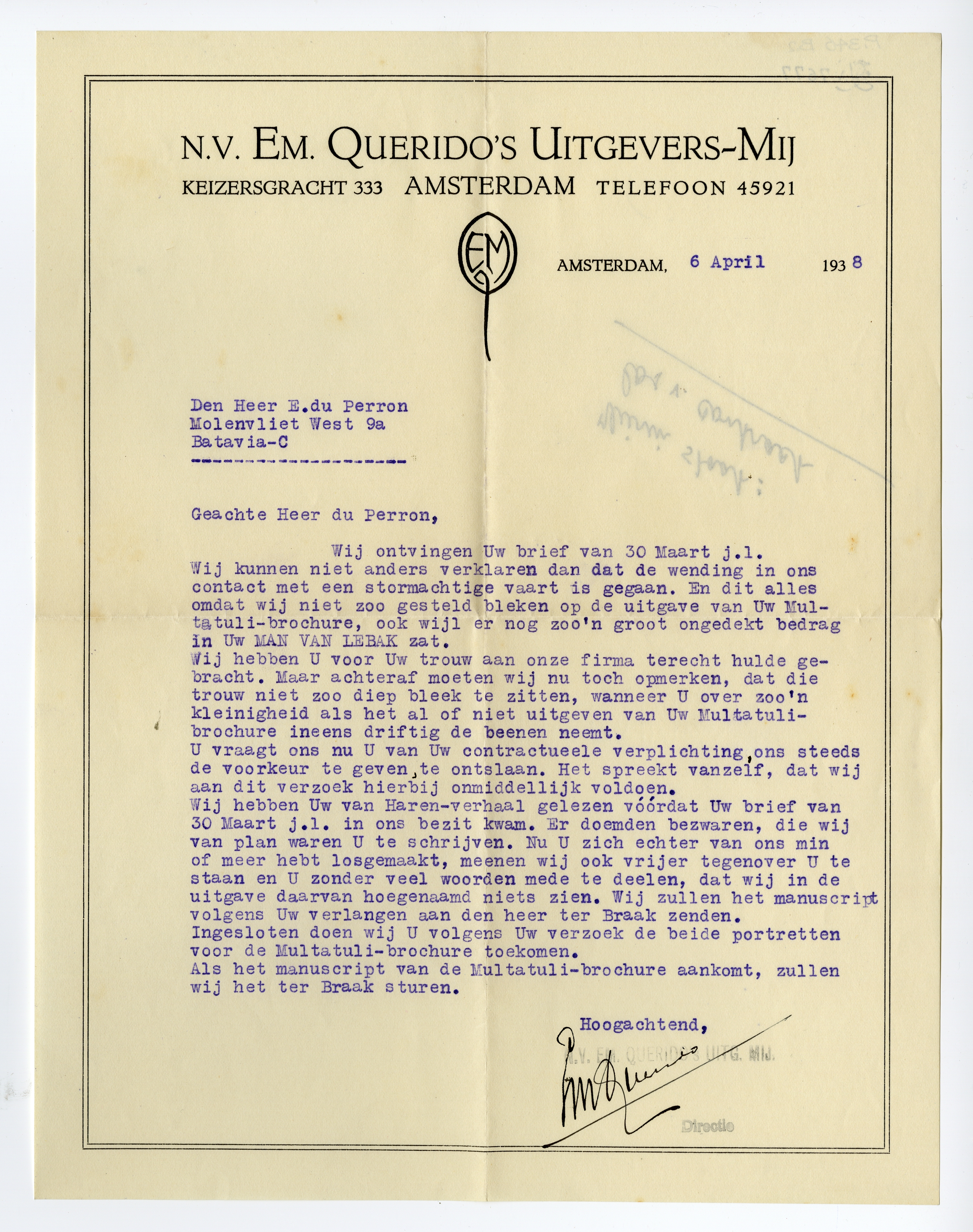 Wij ontvingen Uw brief van 30 Maart j.l. Wij kunnen niet anders verklaren dan dat de wending in ons contact met een stormachtige vaart is gegaan. En dit alles omdat wij niet zoo gesteld bleken op de uitgave van Uw Multatuli-brochure, ook wijl er nog zoo’n groot ongedekt bedrag in UwMAN VAN LEBAK zat.