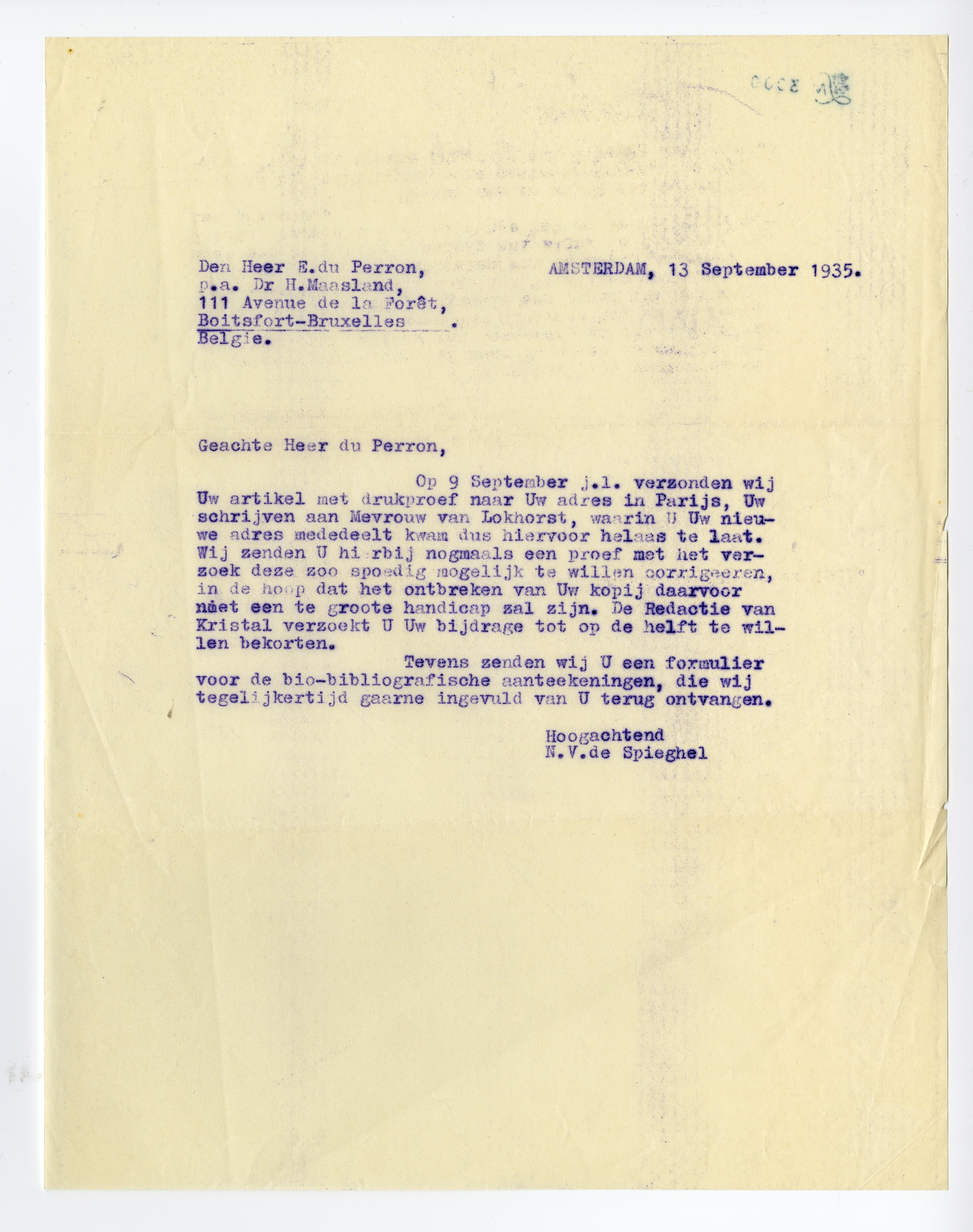 Op 9 September j.l. verzonden wij Uw artikel met drukproef naar Uw adres in Parijs, Uw schrijven aan Mevrouw van Lokhorst, waarin U Uw nieuwe adres mededeelt kwam dus hiervoor helaas te laat. Wij zenden U hierbij nogmaals een proef met het verzoek deze zoo spoedig mogelijk te willen corrigeeren, in de hoop dat het ontbreken van Uw kopij daarvoor niet een te groote handicap zal zijn. De Redactie van Kristal verzoekt U Uw bijdrage tot op de helft te willen bekorten.