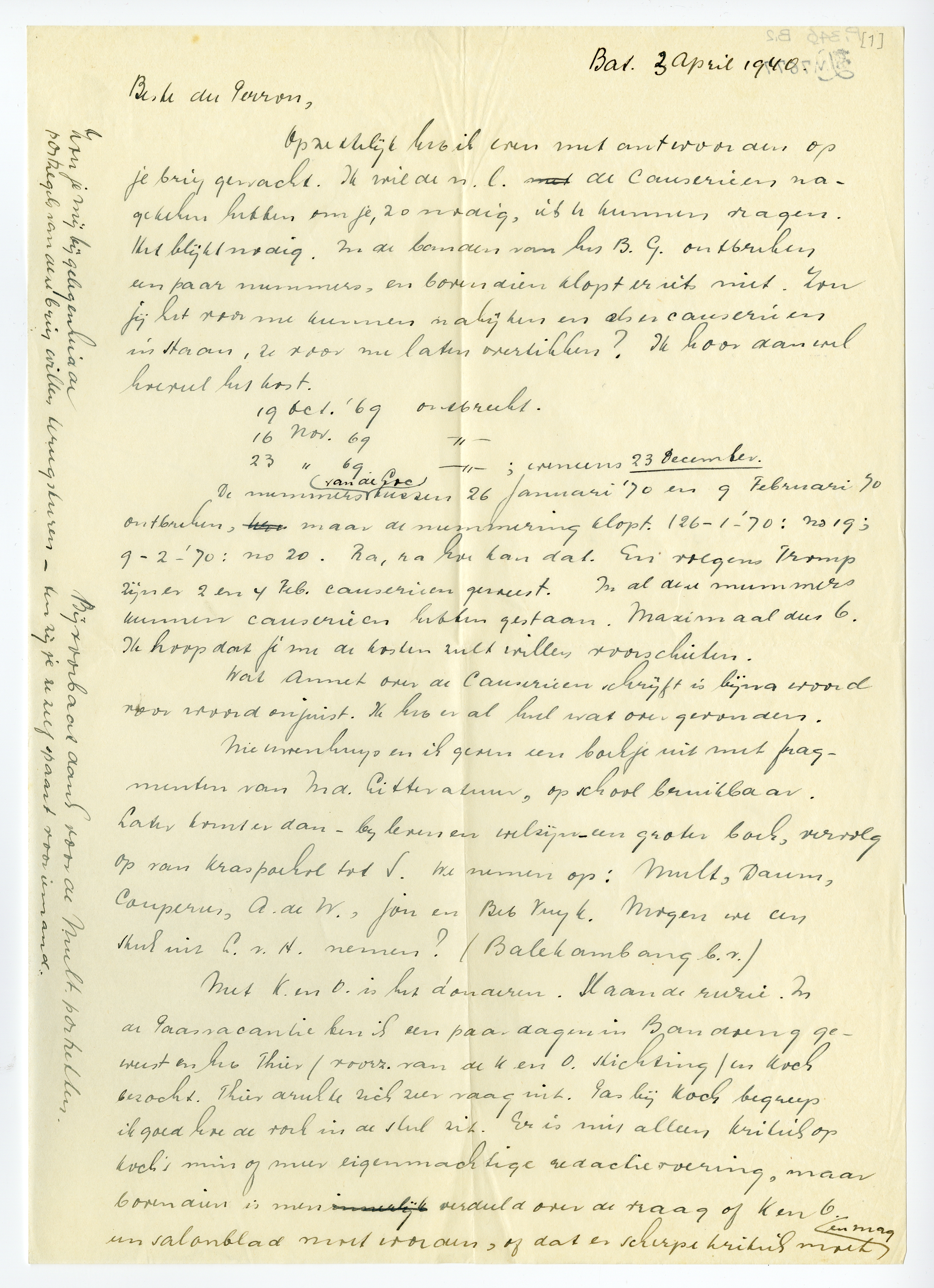 Opzettelijk heb ik even met antwoorden op je brief gewacht. Ik wilde n.l. de Causerieen nagekeken hebben, om je, zo nodig, iets te kunnen vragen. Het blijkt nodig. In de banden van het B.G. ontbreken een paar nummers, en bovendien klopt er iets niet. Zou je het voor mij kunnen nakijken en als er causerieen in staan, ze voor me laten overtikken? Ik hoor dan wel hoeveel het kost.