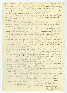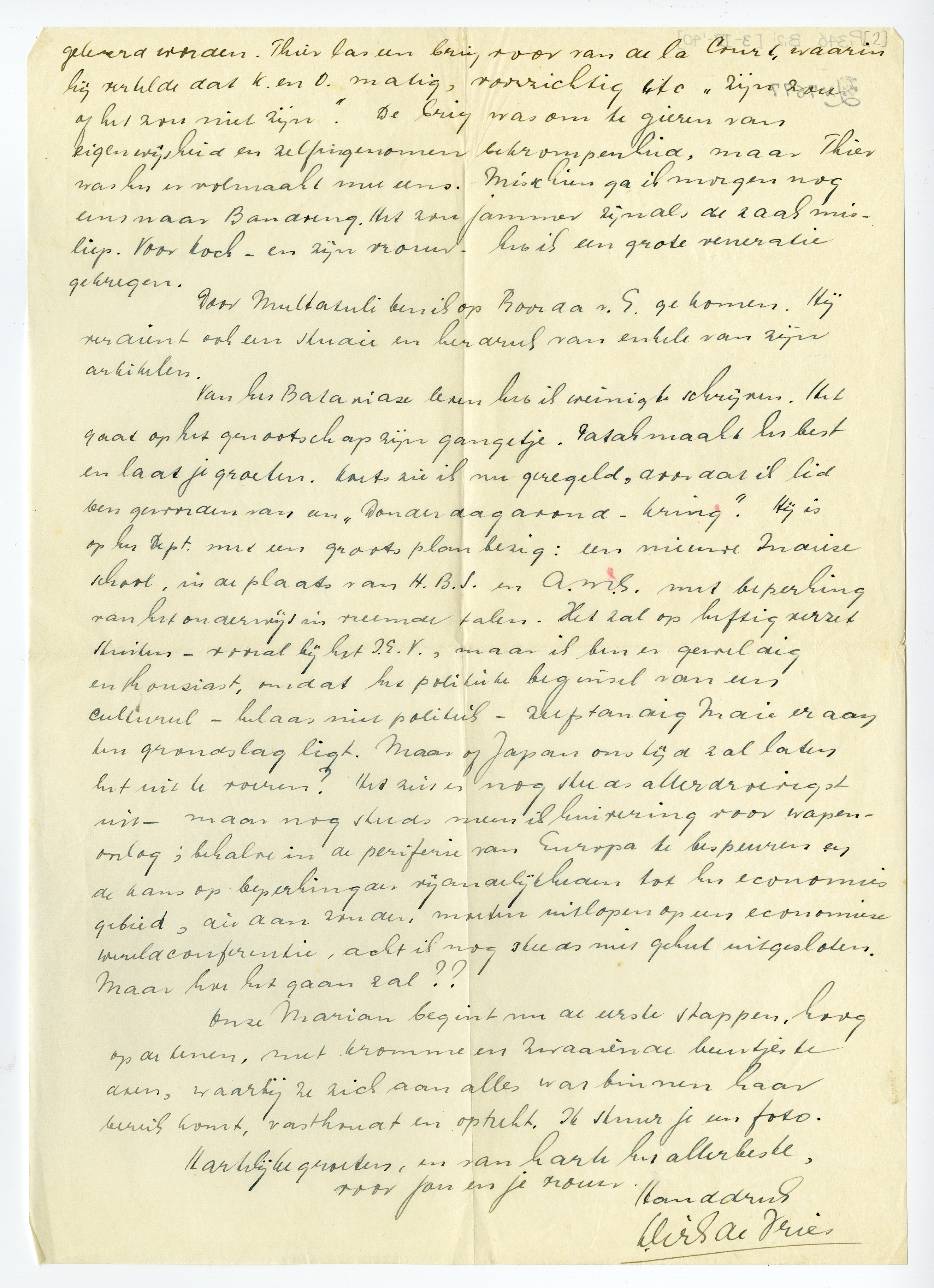 Van het Bataviase leven heb ik weinig te schrijven. Het gaat op het genootschap op zijn gangetje. Patah maakt het best en laat je groeten. Koets zie ik nu geregeld, doordat ik lid ben geworden van een ‘Donderdagavond-kring’. Hij is op het Dept. met een groots plan bezig: een nieuwe Indiese school, in de plaats van H.B.S. en A.M.S. met beperking van het onderwijs in vreemde talen. Het zal op heftig verzet stuiten – vooral bij het I.E.V., maar ik ben er geweldig enthousiast, omdat het politieke beginsel van een cultureel – helaas niet politiek – zelfstandig Indie er aan ten grondslag ligt. Maar of Japan ons tijd zal laten het uit te voeren? Het ziet er nog steeds allerdroevigst uit – maar nog steeds meen ik huivering voor wapenoorlog; behalve in de periferie van Europa te bespeuren en de kans op beperking [onleesbaar] vijandelijkheden tot het economies gebied, die dan zouden, moeten uitlopen op een economiese wereldconferentie, acht ik nog steeds niet geheel uitgesloten. Maar hoe het gaan zal??