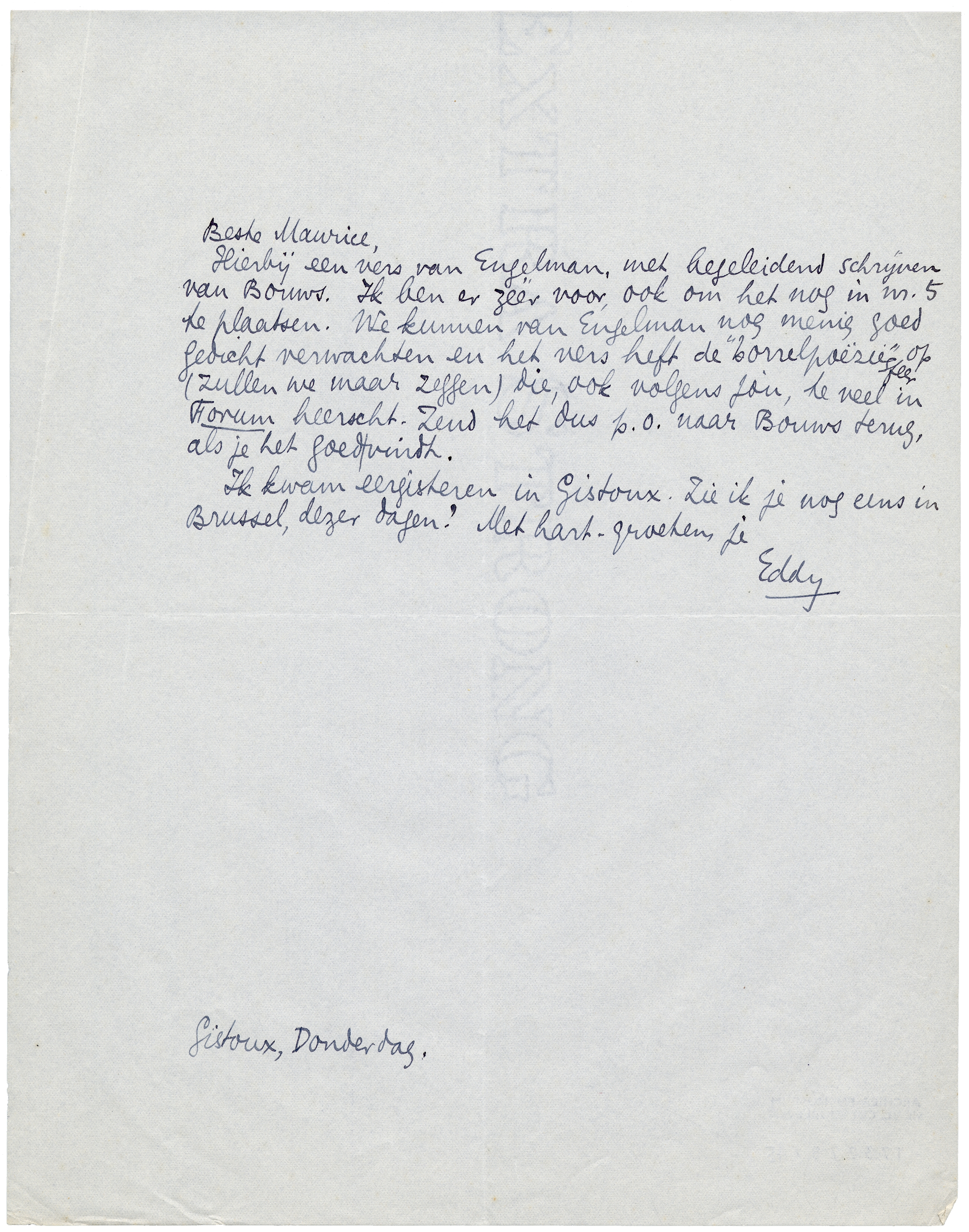 Hierbij een vers van Engelman, met begeleidend schrijven van Bouws. Ik ben er zéér voor, ook om het nog in nr. 5 te plaatsen. We kunnen van Engelman nog menig goed gedicht verwachten en het vers heft de ‘borrelpoëzie’ of sfeer zullen we maar zeggen) die, ook volgens jou, te veel in Forum heerscht. Zend het dus p.o. naar Bouws terug, als je het goed vindt.