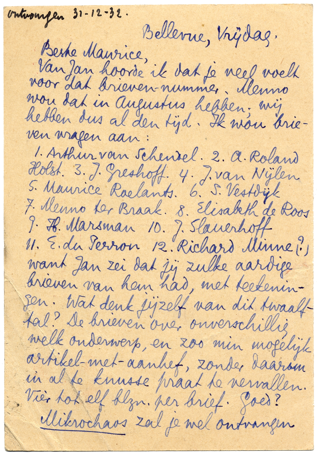 1. Arthur van Schendel. 2. A. Roland Holst. 3. J. Greshoff. 4. J. van Nijlen. 5. Maurice Roelants. 6. S. Vestijk. 7. Menno ter Braak. 8. Elisabeth de Roos. 9. H. Marsman. 10. J. Slauerhoff. 11. E. du Perron. 12. Richard Minne (?) want Jan zei dat jij zulke aardige brieven van hem had, met teekeningen. Wat denk jij zelf van dit twaalftal? De brieven over onverschillig welk onderwerp, en zoo min mogelijk artikel-met-aanhef, zonder daarom in al te knusse praat te vervallen. Vier tot elf blzn. per brief. Goed?