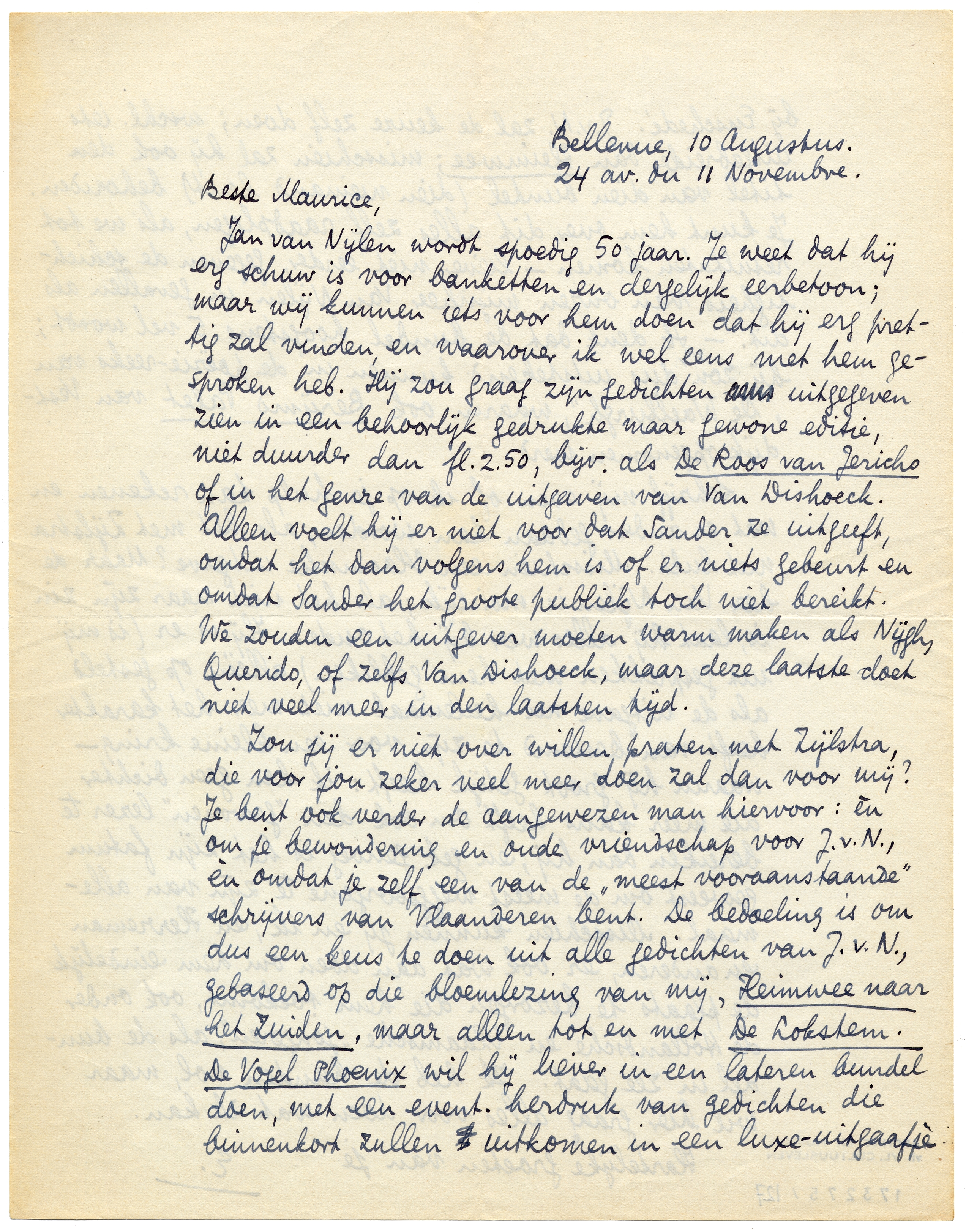 Zou jij er niet over willen praten met Zijlstra, die voor jou zeker veel meer doen zal dan voor mij? Je bent ook verder de aangewezen man hiervoor: èn om je bewondering en oude vriendschap voor J.v.N., èn omdat je zelf een van de ‘meest vooraanstaande’ schrijvers van Vlaanderen bent. De bedoeling is dus om een keus te doen uit alle gedichten van J.v.N., gebaseerd op die bloemlezing van mij, Heimwee naar het Zuiden, maar alleen tot en met De Lokstem. De Vogel Phoenix wil hij liever in een lateren bundel doen, met een event. herdruk van gedichten die binnenkort zullen uitkomen in een luxe-uitgaafje bij Enschedé. J.v.N. zal de keuze zelf doen; wschl. iets uitgebreider dan Heimwee; misschien zal hij ook den titel van dien bundel (dien niemand kent) behouden. Je kunt hem over dit alles zelf raadplegen, als we tot resultaten komen – liever niet eerder, gegeven de schichtigheid van onzen mijnheer Van Nijlen in gevallen als dit. – Ik denk dat de bundel hoogstens 5 vel wordt; hij zou dus uitstekend kunnen in de poëzie-reeks van ‘De Waelburch’, waarin ook Berijmd Palet van Vestdijk opgenomen werd.