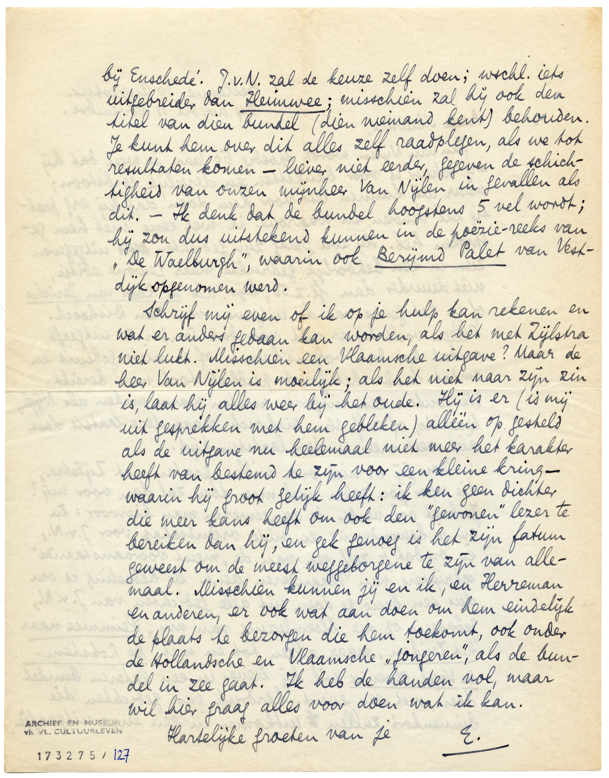 Schrijf mij even of ik op je hulp kan rekenen en wat er anders gedaan kan worden, als het met Zijlstra niet lukt. Misschien een Vlaamsche uitgave? Maar de heer van Nijlen is moeilijk; als het niet naar zijn zin is, laat hij alles weer bij het oude. Hij is er (is mij uit gesprekken met hem gebleken), alléén op gesteld als de uitgave nu heelemaal niet meer het karakter heeft van bestemd te zijn voor een kleine kring – waarin hij groot gelijk heeft: ik ken geen dichter die meer kans heeft om ook den ‘gewonen’ lezer te bereiken dan hij, en gek genoeg is het zijn fatum geweest om de meest weggeborgene te zijn van allemaal. Misschien kunnen jij en ik, en Herreman en anderen, er ook wat aan doen om hem eindelijk de plaats te bezorgen die hem toekomt, ook onder de Hollandsche en Vlaamsche ‘jongeren’, als de bundel in zee gaat. Ik heb de handen vol, maar wil hier graag alles voor doen wat ik kan.