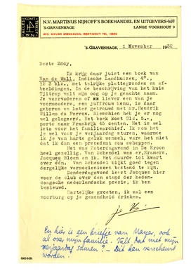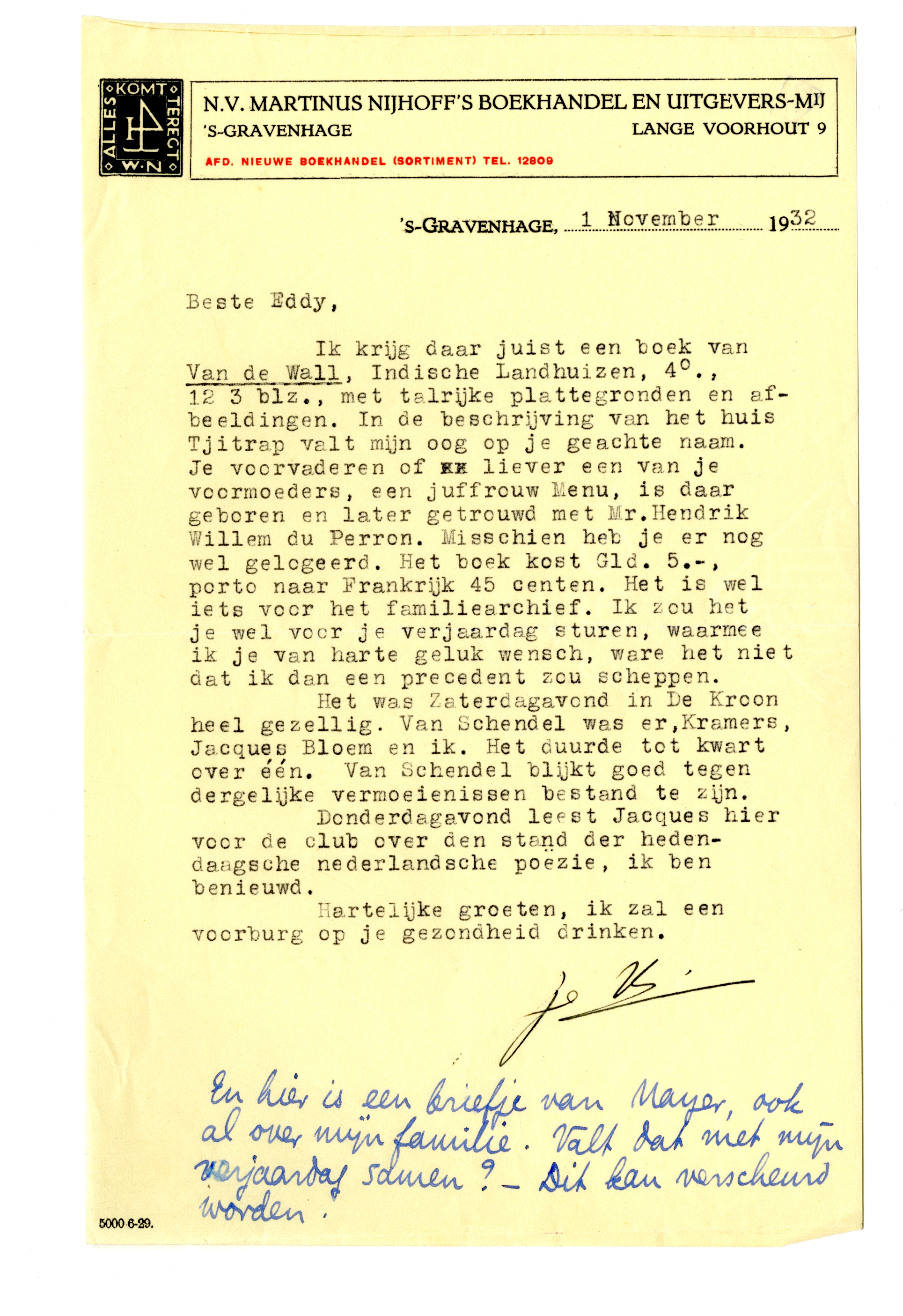 Ik krijg daar juist een boek van Van de Wall, Indische Landhuizen, 4o., 123 blz., met talrijke plattegronden en afbeeldingen. In de beschrijving van het huis Tjitrap valt mijn oog op je geachte naam. Je voorvaderen of liever een van je voormoeders, een juffrouw Menu, is daar geboren en later getrouwd met Mr. Hendrik Willem du Perron. Misschien heb je er nog wel gelogeerd. het boek kost Gld. 5.-, porto naar Frankrijk 45 centen. Het is wel iets voor het familiearchief. Ik zou het je wel voor je verjaardag sturen, waarmee ik je van harte geluk wensch, ware het niet dat ik dan een precedent zou scheppen.