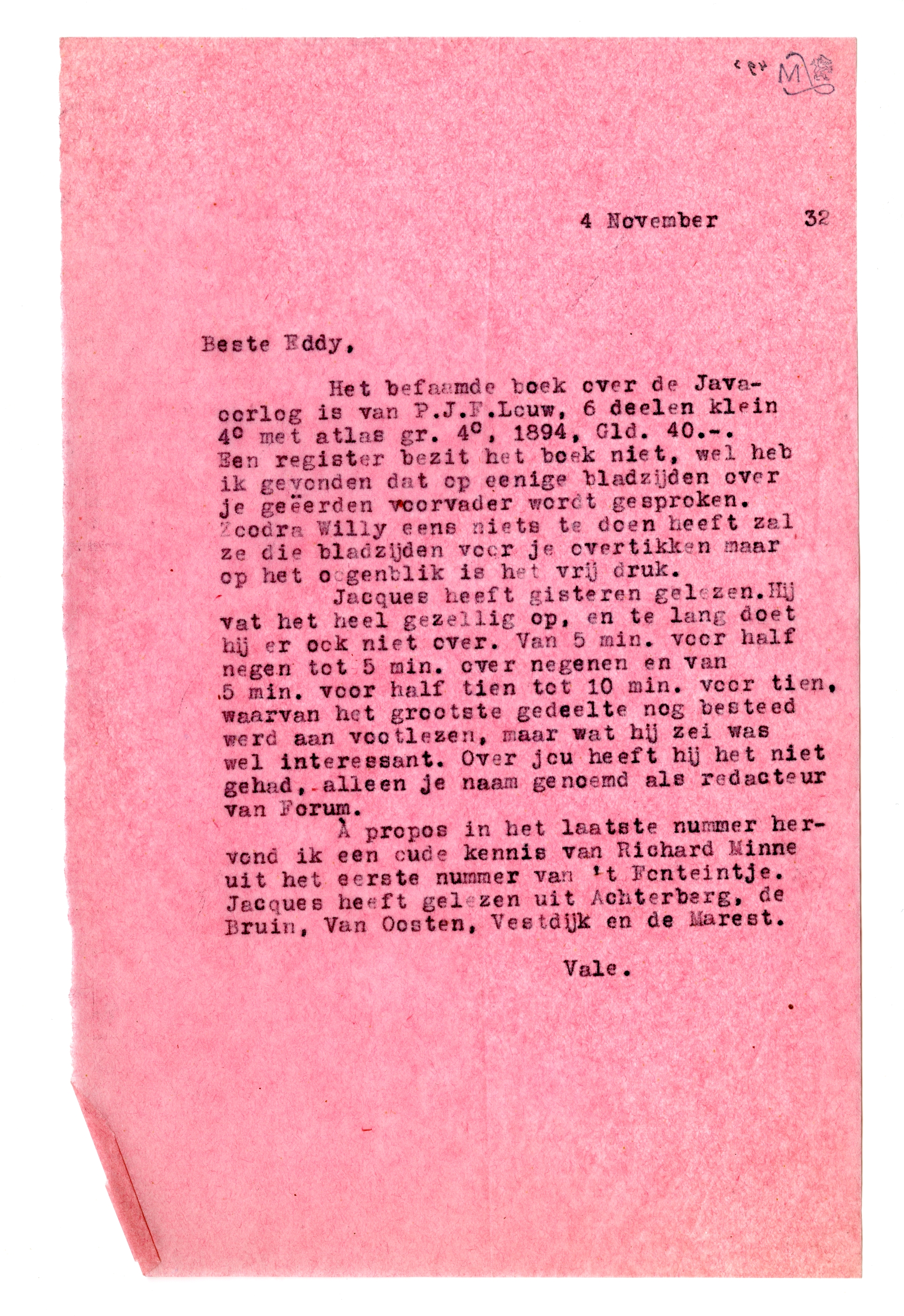 Het befaamde boek over de Java-oorlog is van P.J.F. Leuw, 6 deelen klein 4o met atlas gr. 4o, 1894, Gld. 40.-. Een register bezit het boek niet, wel heb ik gevonden dat op eenige bladzijden over je geëerden voorvader wordt gesproken. Zoodra Willy eens niets te doen heeft zal ze die bladzijden voor je overtikken maar op het oogenblik is het vrij druk.