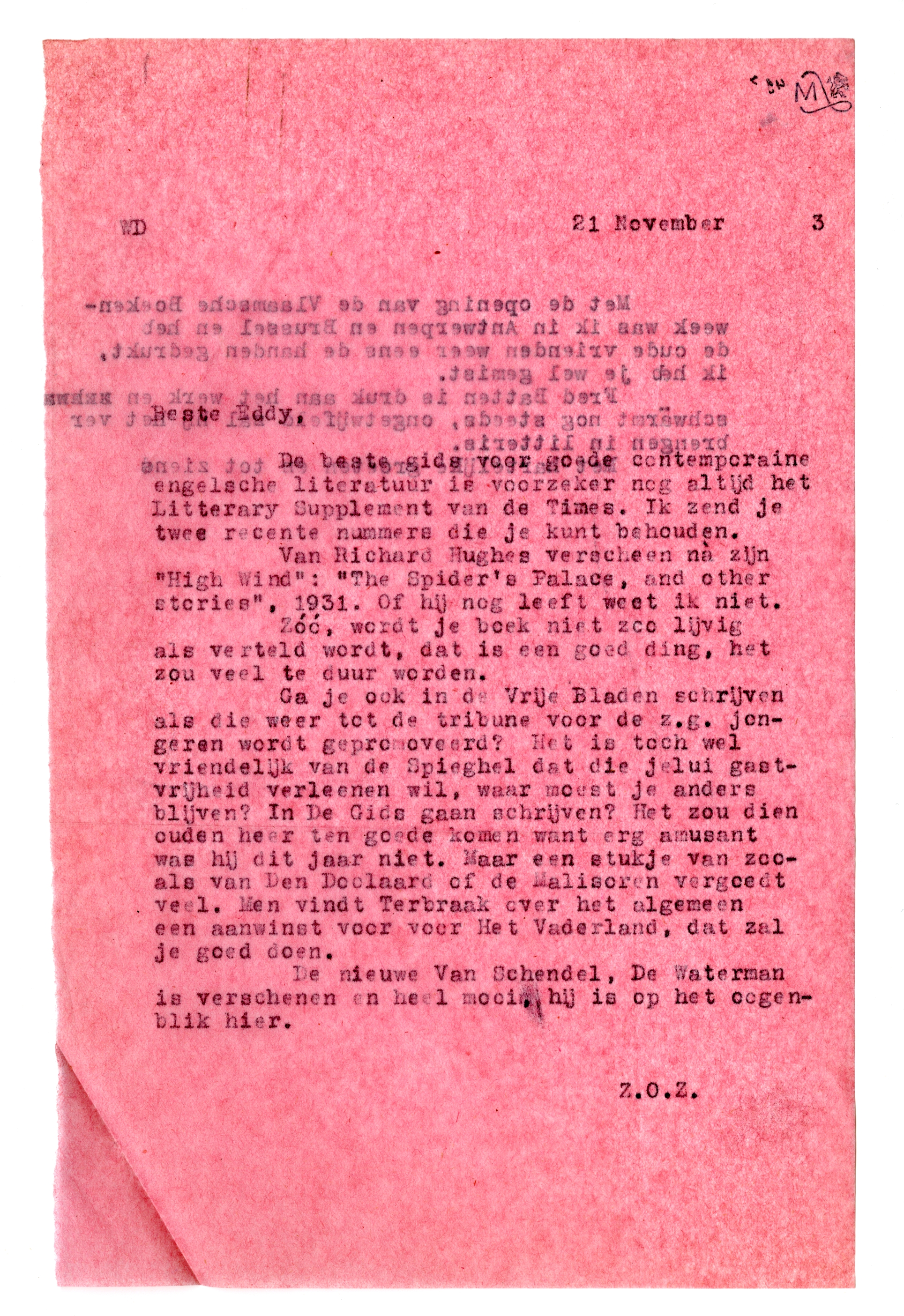 De beste gids voor goede contemporaine engelsche literatuur is voorzeker nog altijd het Litterary Supplement van de Times. Ik zend je twee recente nummers die je kunt behouden.