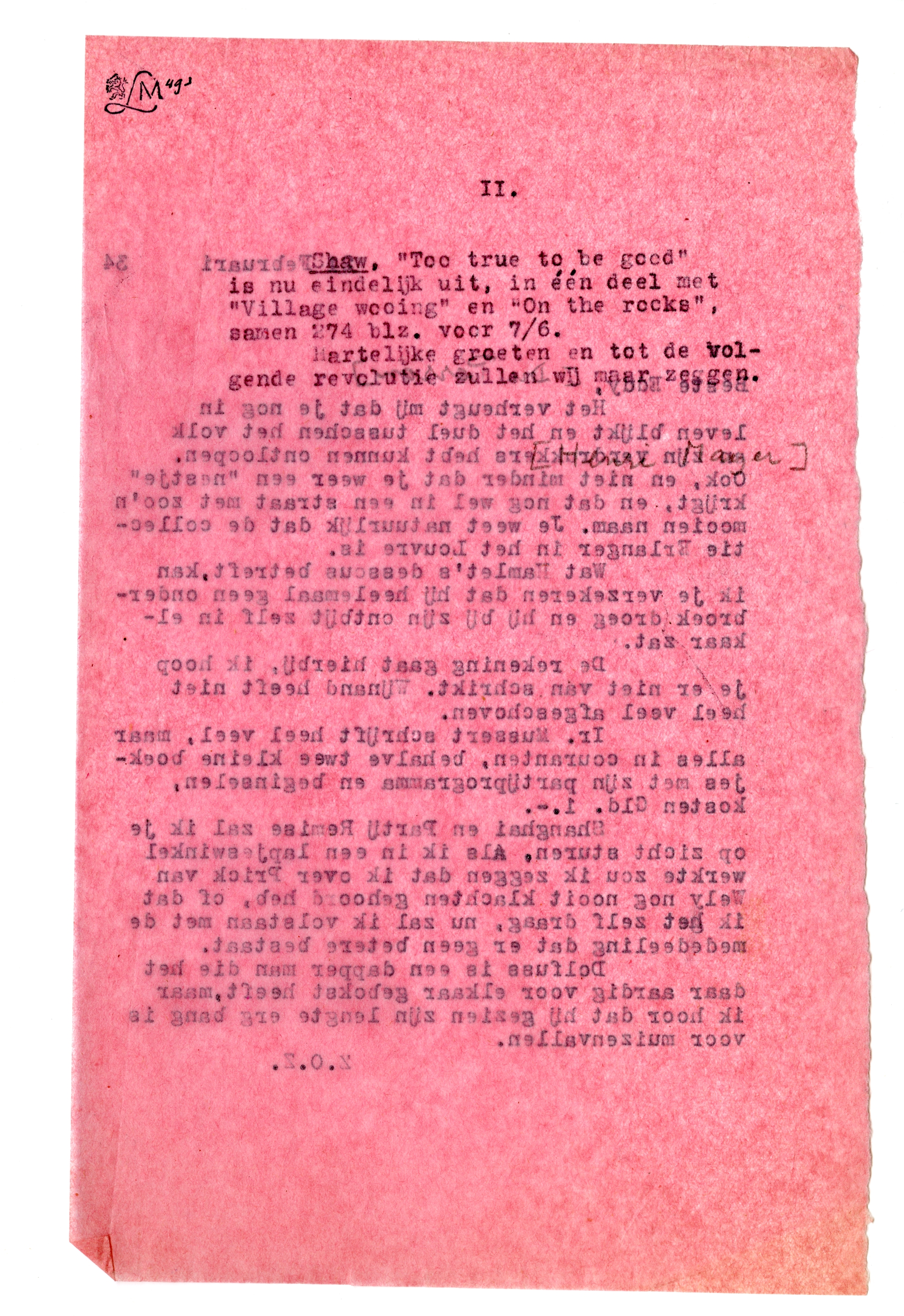 Shaw, ‘Too true to be good’ is nu eindelijk uit, in één deel met ‘Village wooing’ en ‘On the rocks’, samen 274 blz. voor 7/6.